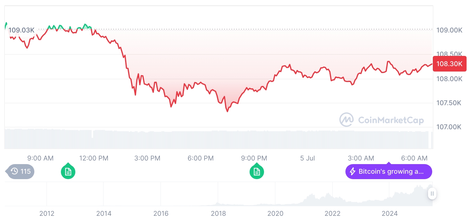 《晚间行情简报》加密货币市场下跌…比特币报108,308美元,以太坊报2,527美元
