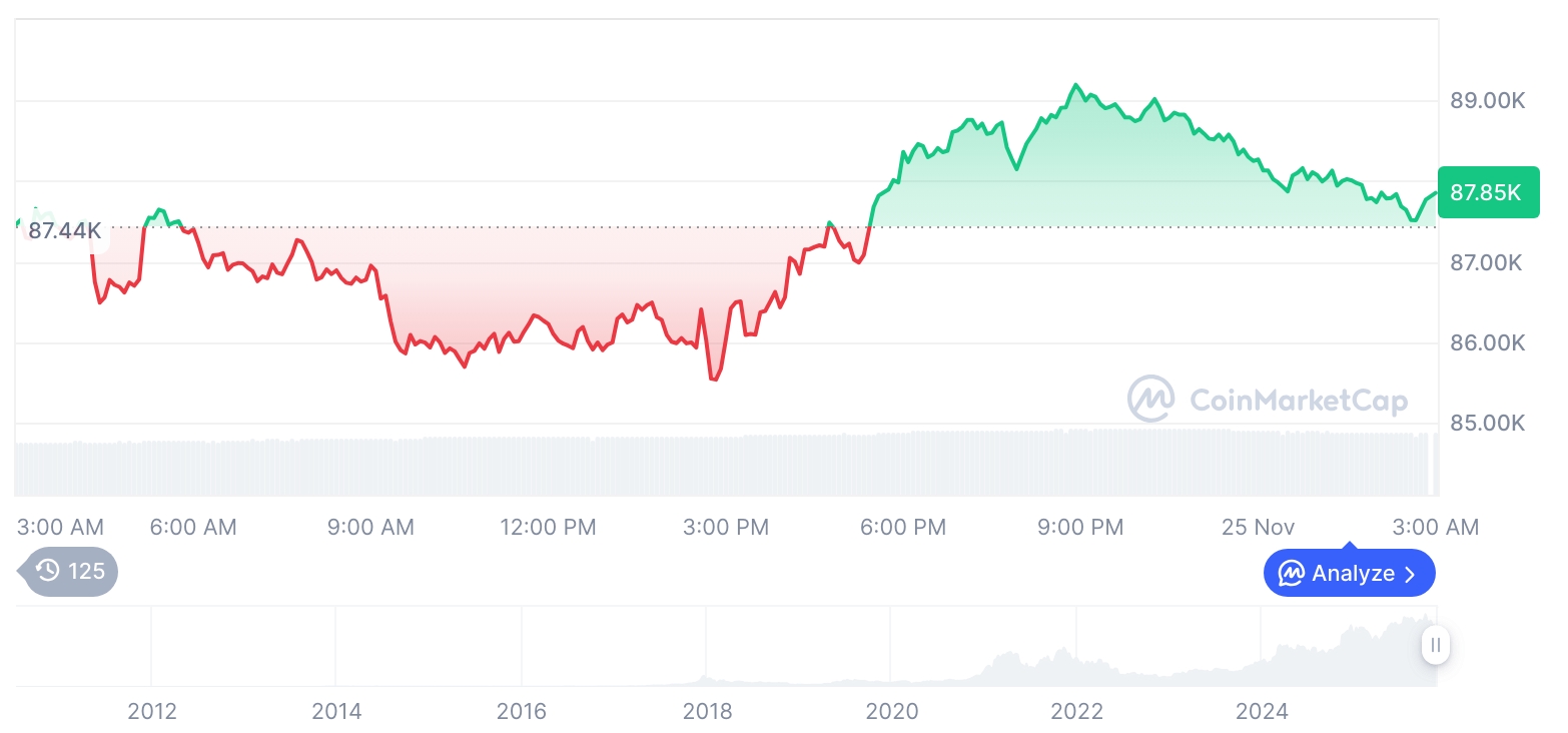 比特币反弹显露疲态,关键阻力区压制价格上行 比特币近期的复苏尝试正显现乏力迹象,在关键的89,500美元至90,000美元阻力区间下方失去动能。尽管本周早些时候从82,000美元位置强势反弹,但由于技术指标显示上行压力减弱,市场情绪正转向谨慎。 技术面呈现多空博弈 数据显示比特币曾突破85,000美元和86,500美元阻力位,成功收复从92,872美元波动高点到80,595美元低点之间的50%斐波那契回撤区域。然而在89,000至90,000美元区间附近持续存在抛压,阻碍了有效突破,暗示下行走势可能延续。 关键阻力与支撑位分析 小时线图表显示89,000美元位置已形成看跌趋势线。虽然比特币2025-11-25