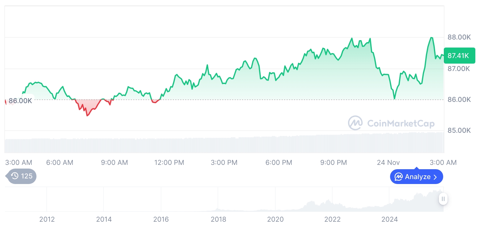 [午后行情速递]加密货币市场走势分化:比特币报87,463美元,以太坊报2,837美元