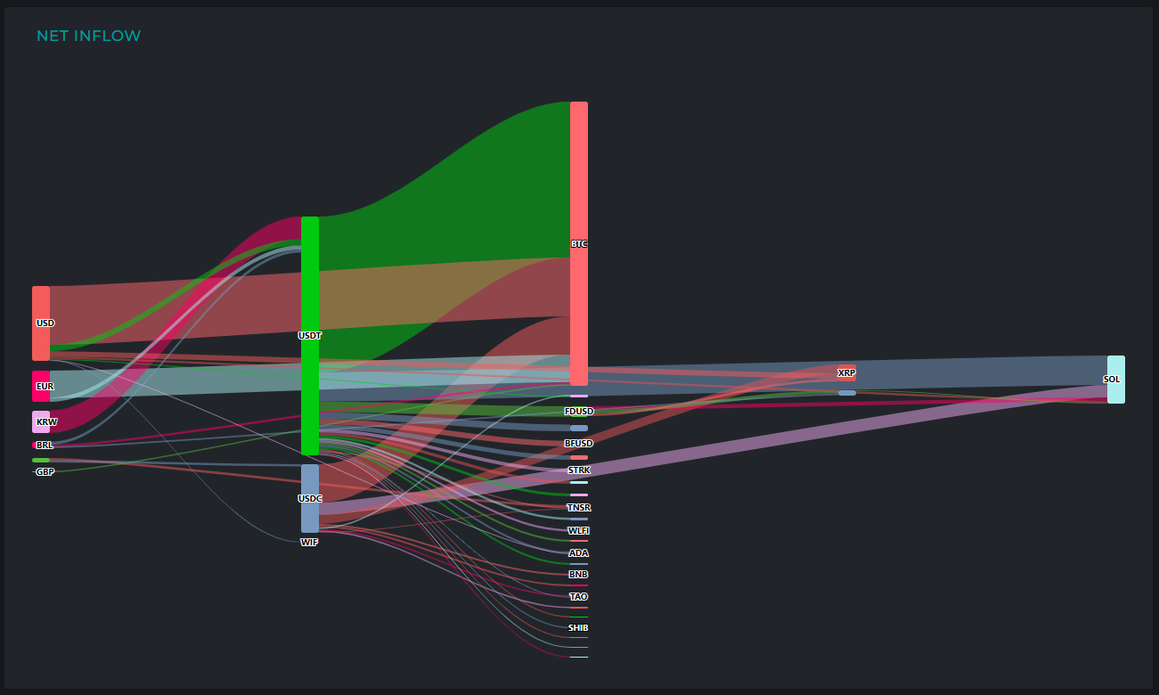 加密货币市场资金流向分析 比特币作为单一资产创下3.4亿美元资金流入纪录的同时,以太坊、BNB等主要竞争币则出现大规模资金净流出。 法币资金流向 截至24日统计数据显示:以美元计价的8950万美元资金中,7000万美元流向比特币,770万美元转为USDT,少量资金分散至SOL、DOGE、ADA等资产。欧元计价的3860万美元资金中,3340万美元流向比特币,510万美元转为USDT,呈现向两大主流资产集中的趋势。韩元计价的2840万美元中,2730万美元转为USDT,100万美元转为WLFI。巴西雷亚尔计价的830万美元资金分散至USDT、比特币、以太坊等资产。土耳其里拉计价的580万美元 -
