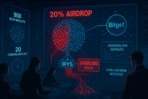 IRYS启动风波:女巫攻击阴影下的公平性质疑 IRYS本周高调登场,以"链上AWS"为定位的去中心化数据基础设施层项目,在获得超1300万美元风投资金支持后,承诺为Web3提供更经济、高效、稳健的数据通道。然而上线48小时内,@bubblemaps的最新研究却揭示了另一番景象:900个高度相似的钱包地址攫取了20%的空投份额,并将价值数百万美元的代币集中转移至Bitget交易所,引发了对女巫攻击、预注资钱包及代币分配公平性的新一轮质疑。 精密操作的时间轨迹 IRYS此前将8%的代币预留用于早期用户空投,旨在奖励真实用户并推动去中心化。但数据显示,一个协同操作的钱包集群在截止日期前完成了精准 -