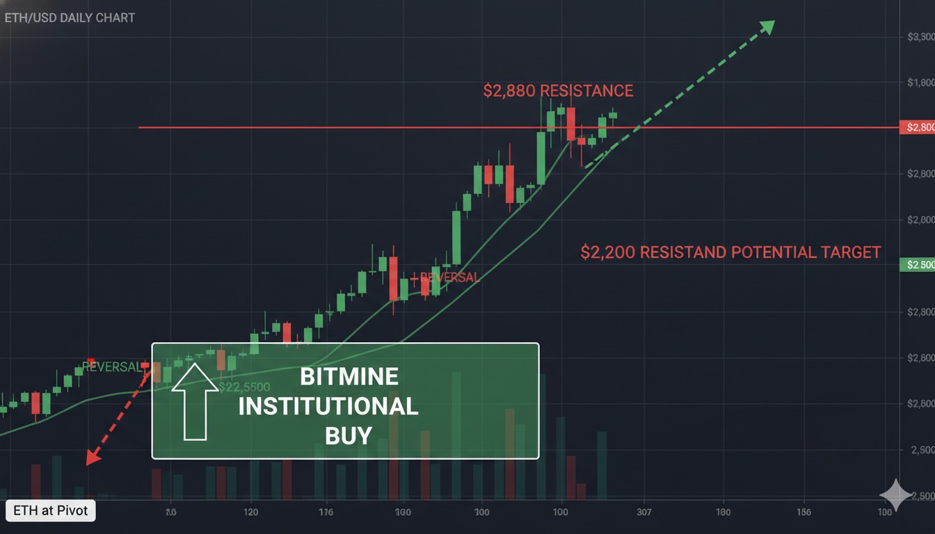 以太坊关键阻力位博弈 以太坊正与2880美元的关键阻力位展开激烈博弈,这一水平正在考验市场决心。虽然加密货币已显现早期看涨势头,但目前仍处于十字路口,需要攻克明确的阻力位。 技术形态显现转机 根据分析师观察,以太坊在4小时图表上形成了低点、更高低点、高点以及更高高点的走势模式,这预示着可能出现趋势反转的初步信号。然而2880美元阻力位至关重要。分析师指出,若以太坊在此受阻,可能导致空头目标失效;若能有效突破,则可能推动价格上探3200美元阻力位。日线图上2580美元需求区仍是关键支撑区域,值得在反转后关注潜在多头入场机会。 机构资金大举入场 市场动能进一步增强,Bitmine通过大宗交易购2025-11-23