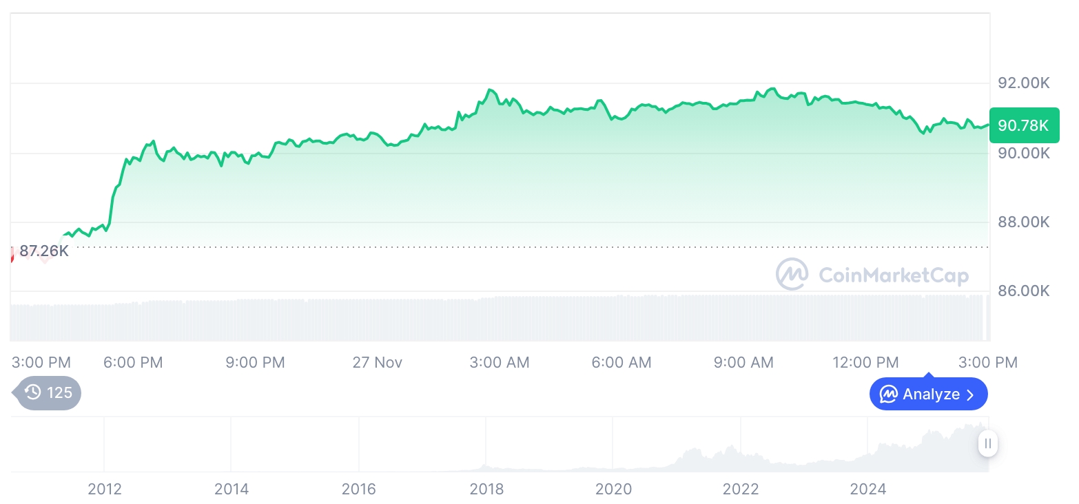 核心洞察 感恩节期间比特币价格飙升逾5%,点燃了市场乐观情绪。此轮上涨恰逢美联储降息预期升温及美股市场走强。分析师预测,若在持续上行趋势中突破关键阻力位,BTC价格有望触及10万美元大关。 市场动态解析 比特币的感恩节涨势提振了投资者情绪,整个加密市场的表现便是明证。BTC日内涨幅近5%,表明多头正重拾对该资产的信心。值得关注的是,此前主流加密货币的剧烈暴跌曾令交易者恐慌,许多投资者仍持观望态度。尽管如此,近期突破90,000美元关口的走势表明比特币美元牛市尚未终结。 与此同时,资产价格攀升引发了对本轮涨势背后动因的探讨。专家指出,美股市场走强及美联储12月降息概率激增,可能共同助推了感2025-11-28