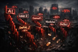市场全景:结构性溃败,而非短期回调 最新数据显示,从曾经热捧的人工智能与二层网络,到新兴的去中心化AI与去中心化科学概念,加密市场多个板块在今年遭遇了剧烈且持续的下跌。这并非短期回调,而是一场结构性的价值回归。 垫底板块:概念与现实的割裂 表现最惨烈的是去中心化AI板块,平均跌幅达97%。曾被寄予厚望的代币如GRIFFAIN和LMT,试图融合去中心化金融与人工智能两大热门叙事,但实践中流动性迅速枯竭,实际应用未能落地,投机溢价彻底蒸发。 模块化区块链概念以92%的跌幅紧随其后。尽管TIA、AVAIL、DYM等项目曾被视作可扩展基础设施的未来,但实际需求远不及预期。投资者逐渐意识到,模块化设计 -