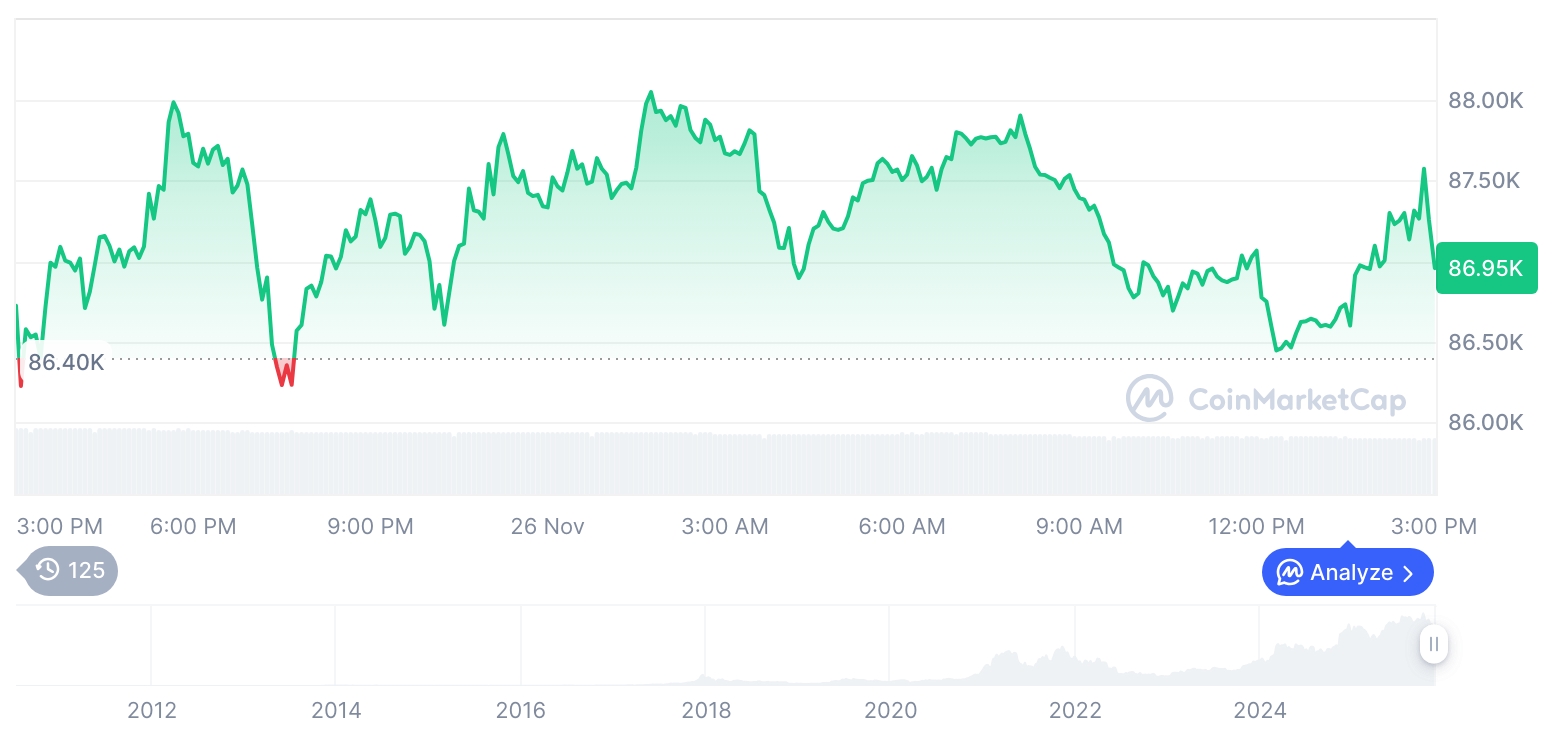 [午夜行情速递]加密货币市场走势分化:比特币报86,841美元,以太坊徘徊于2,908美元