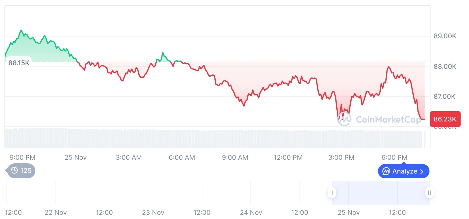[早间行情简报]加密货币市场普遍下跌:比特币报86,800美元,以太坊跌至2,918美元