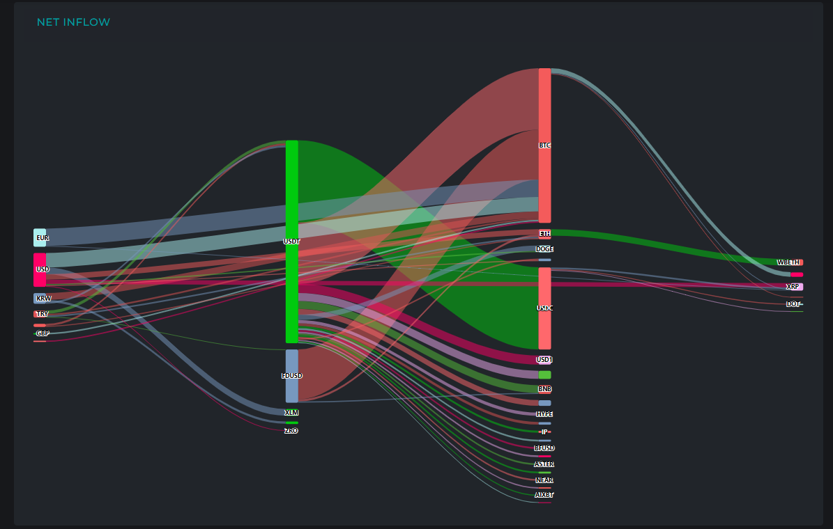 比特币成为主要资金流入渠道 市场防御性布局增强 在美元与稳定币主导的大规模资金流动中,比特币凭借强劲的资金吸纳能力,进一步巩固了市场的防御性布局。 美元资金流向分析 数据显示,当日美元计价资金总流入达3210万美元。其中比特币以1360万美元的流入规模占据主导地位,恒星币和以太坊分别录得630万与520万美元资金流入。其余资金分散至瑞波币、狗狗币及黄金稳定币等资产。 欧元与韩元资金动向 欧元计价资金流入达1710万美元,其中1650万美元集中流向比特币。韩元计价资金流入为1030万美元,640万美元注入比特币,其余分流至泰达币及佩佩币等资产。 稳定币资金迁徙图谱 泰达币出现1.917亿美