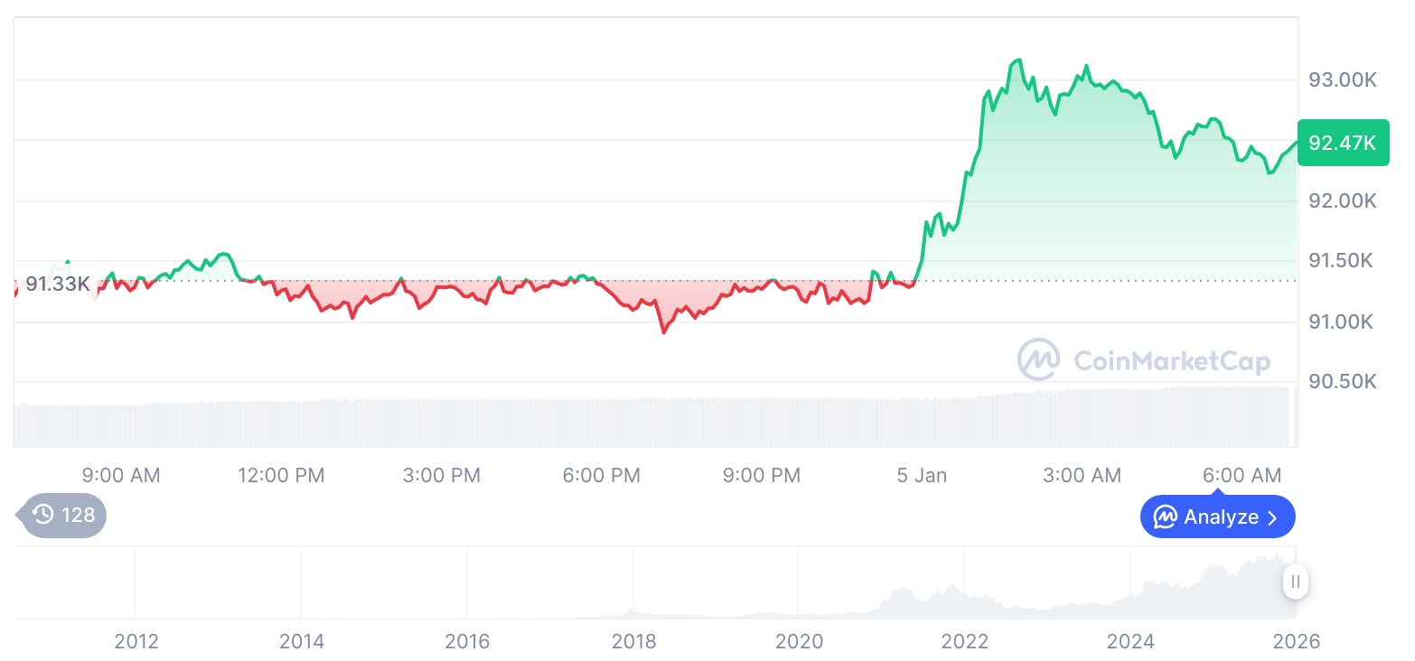 核心要点 在涉及美国军事行动的传闻影响下,比特币价格突破九万美元大关。市场对于影响比特币的未经证实的地缘政治事件做出反应。在监管指引有限的背景下,金融市场已出现波动迹象。 2026年1月5日,在有关美国于委内瑞拉采取行动影响全球金融市场的报道中,比特币价格飙升至九万美元以上。该事件凸显了比特币对地缘政治行动的敏感性,反映出市场的波动性以及投资者对国际局势影响加密货币需求的担忧。 事件关联分析 比特币价格的飙升可能与美国在委内瑞拉的行动有关。价格在短暂下跌后突破九万美元,引发了广泛的市场反应。未经证实的报道将此价格波动与美国的相关行动相联系,主要机构尚未发布正式声明。由于相关信息来自间接渠道对市2026-01-05