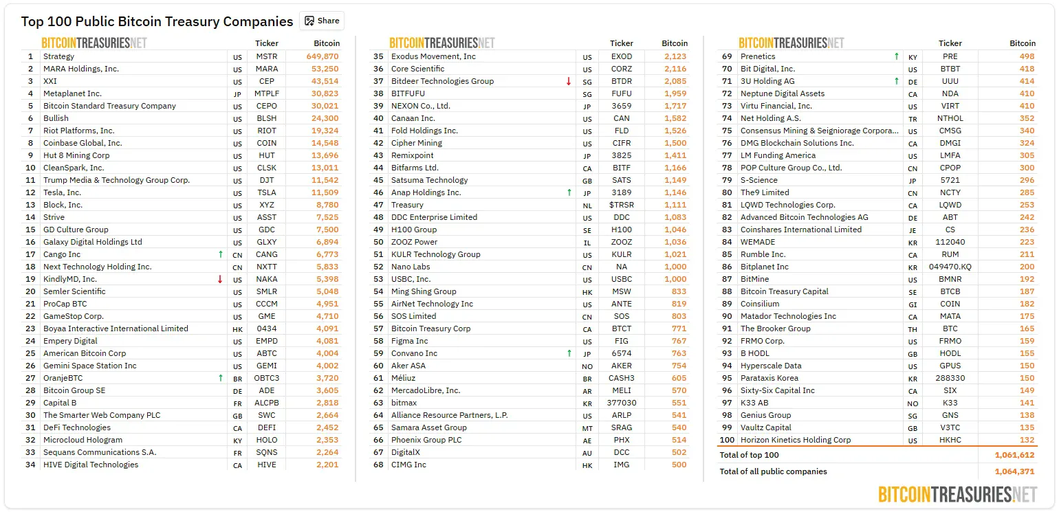 机构比特币持仓总量达401万枚 根据比特币持仓统计数据显示,截至最新统计日,机构持有的比特币总量为401万枚,最近30天内减少约0.91%。同期持有比特币的机构数量增加5家,总数扩大至357家。 上市公司 持仓量:1,064,371 BTC|约936.11亿美元|占比特币总供应量5.06% 上市公司中,微策略公司持有649,870枚比特币,占供应总量的3.095%,继续保持单一最大持仓机构地位。该公司本月3日增持397枚、10日增持487枚后,于11日再次增持8,178枚。 目前国内有5家上市公司持有比特币。虽然持仓量较上周无变动,但比特星球和帕拉出租车韩国公司的排名均有所上升。 私营企业2025-11-25