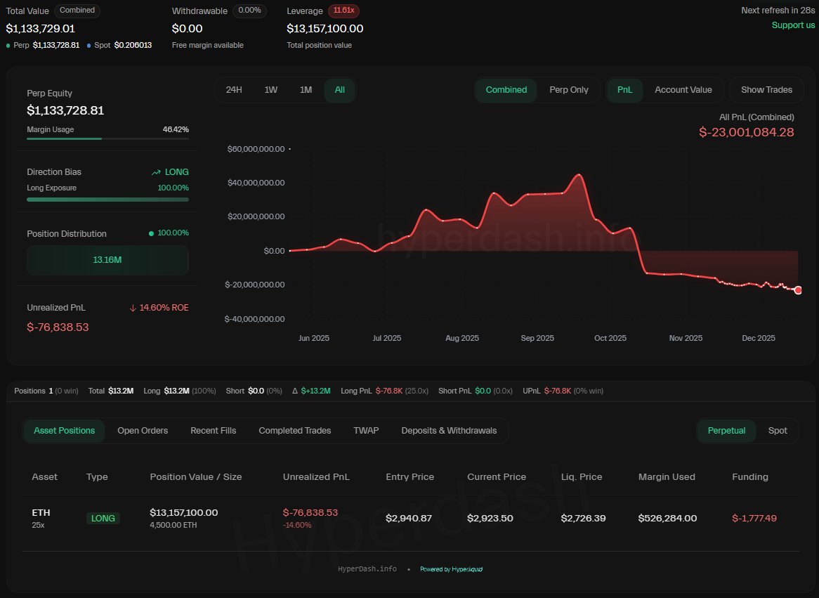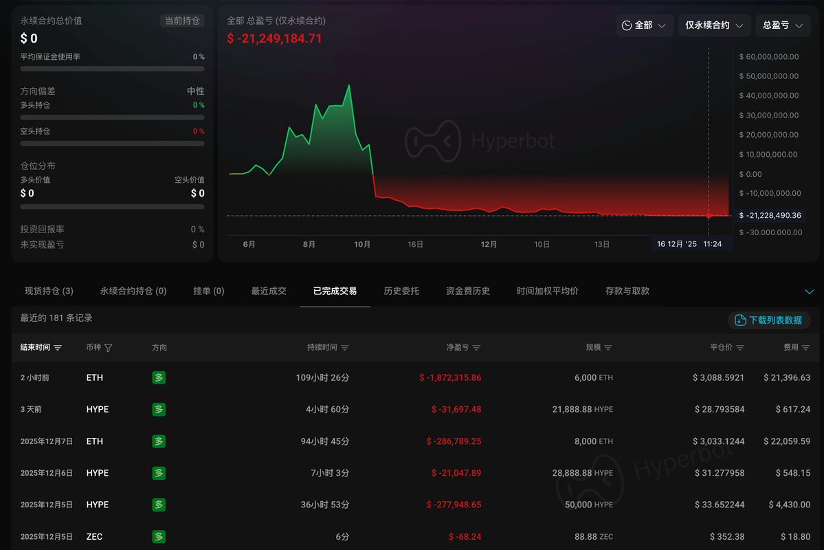 加密货币市场波动导致早期比特币持有者面临巨额浮亏随着加密货币价格持续下跌,杠杆效应开始显现反向作用,一位知名早期比特币持有者正面临巨额账面亏损。持仓概况该早期比特币持有者在比特币、以太坊和Solana的大额多头头寸上承受着约5400万美元的未实现亏损。此番回撤发生在加密货币市场走弱、清算量上升且市场恐慌情绪加剧的背景下。分析师持续警告称,在宏观和政策不确定性时期,高杠杆操作仍然存在较大风险。根据链上分析平台12月16日披露的数据,这个常被称为“比特币元老”的地址目前在三大主流币种的大额多头仓位中面临巨额浮亏。该交易者此前曾实现逾1.19亿美元盈利,但随着市场转弱,利润已缩减至约5000万美元。2 小时前