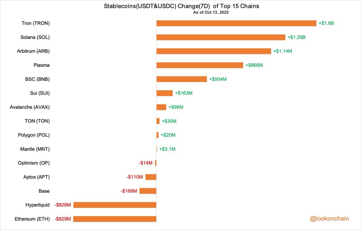 大规模市场崩盘导致164万+交易者被清算,金额超过192亿美元,随着波动性激增,DEX交易量飙升。Tron引领稳定币流入,而meme和BNB生态系统(收入增长4.5倍)出人意料地保持韧性。