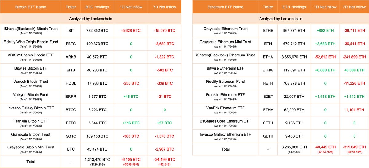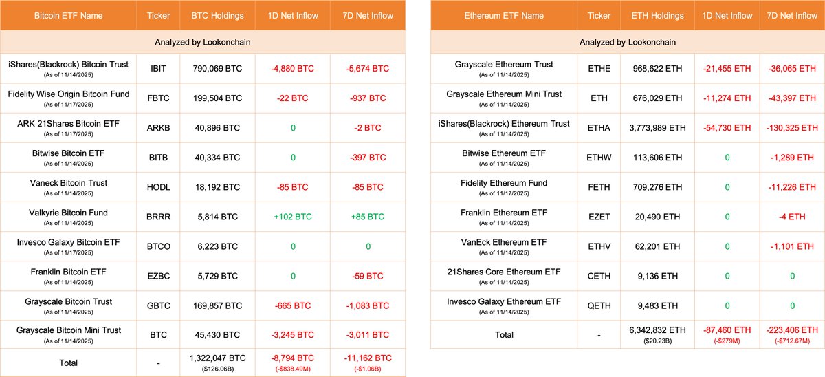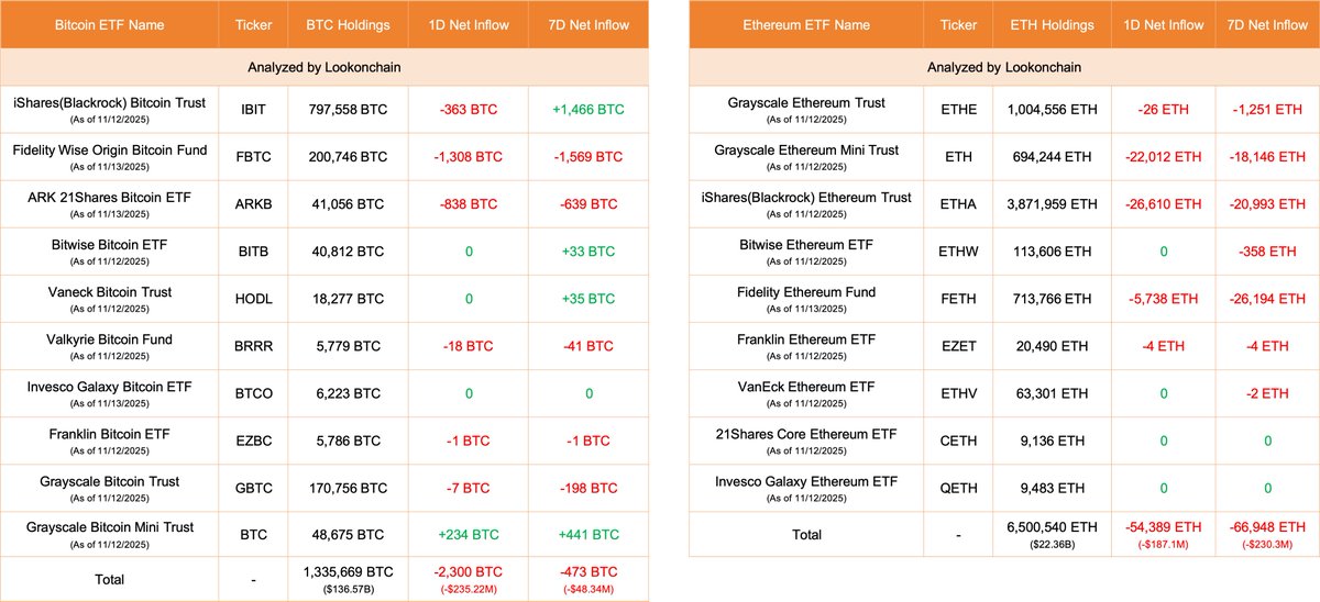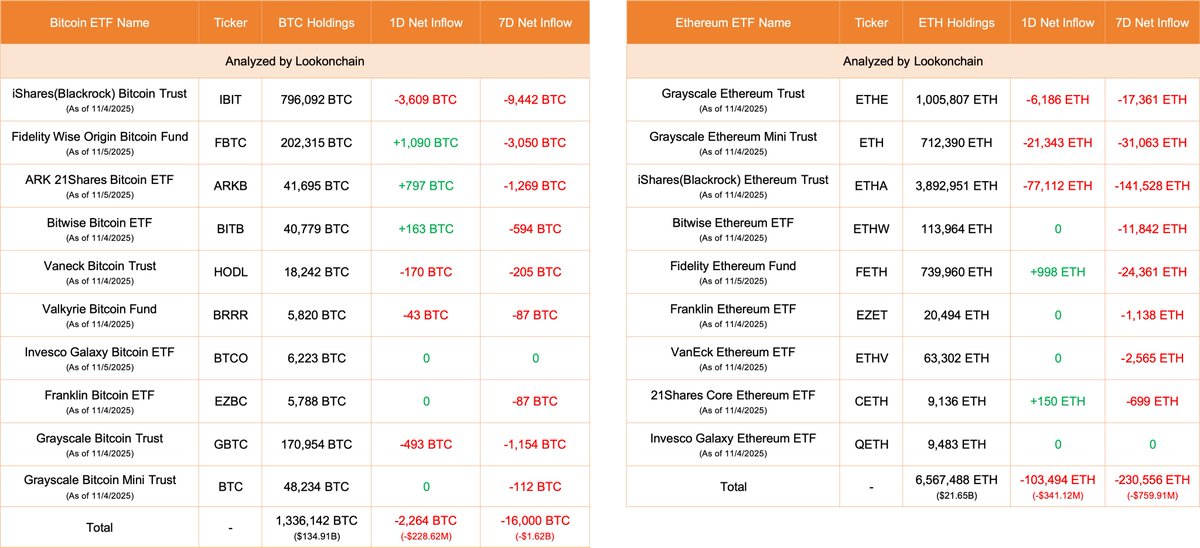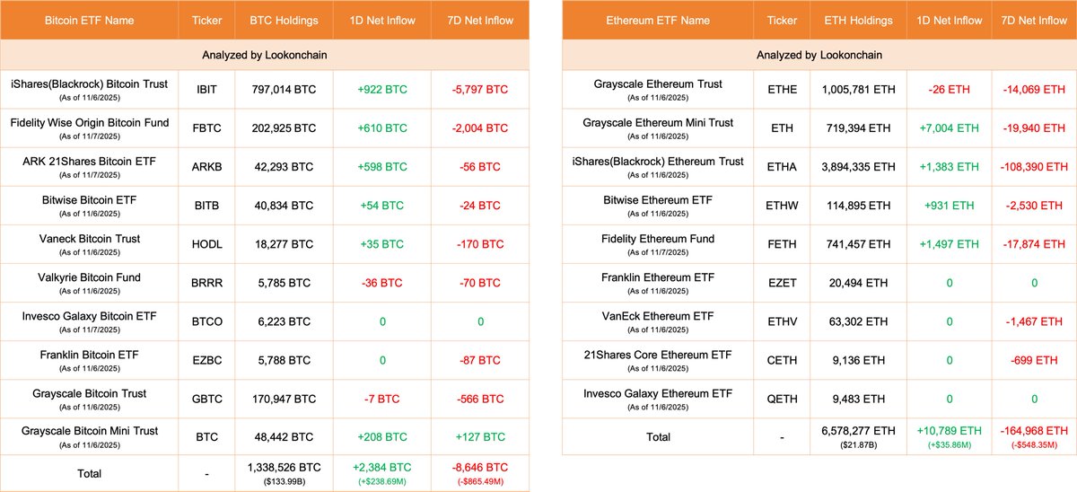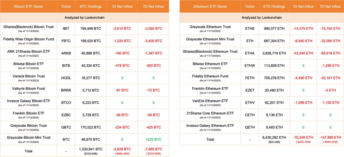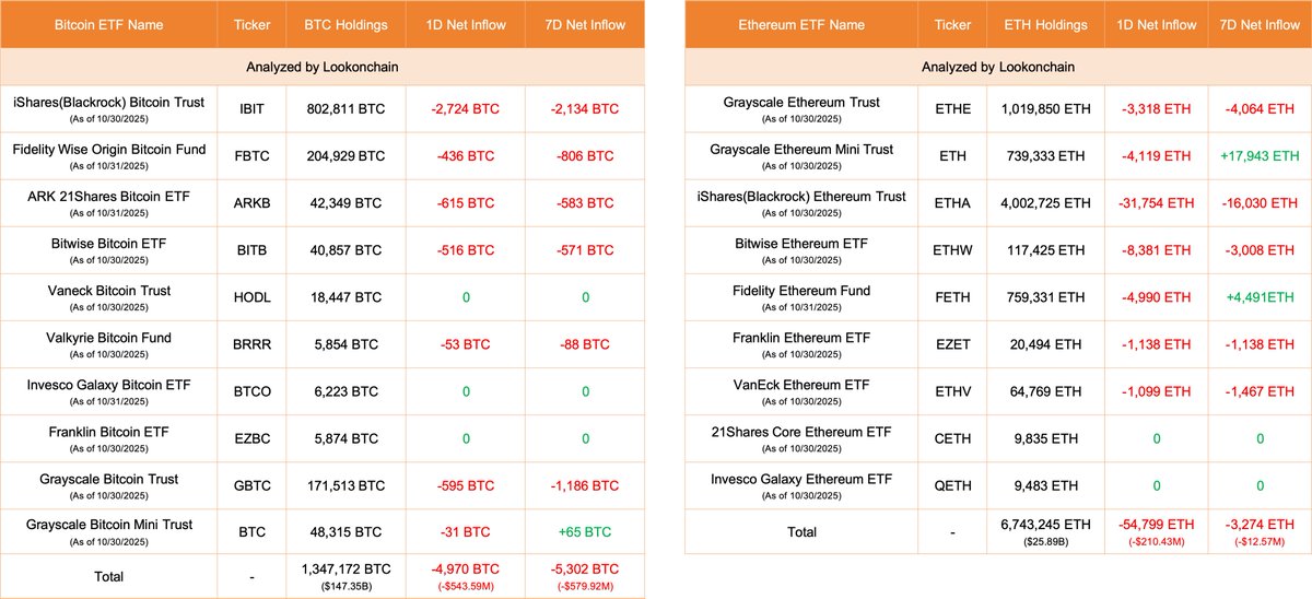 11月3日更新:10只 #Bitcoin ETF 净流出:-1,987 $BTC(-$213.65M)🔴 #BlackRock 流出1,362 $BTC($146.46M),目前持有801,449 $BTC($86.19B)。9只 #Ethereum ETF 净流出:-21,022 $ETH(-$78.2M)🔴 #BlackRock 流出9,980 $ETH($37.13M),目前持有3,992,745 $ETH($14.85B)。