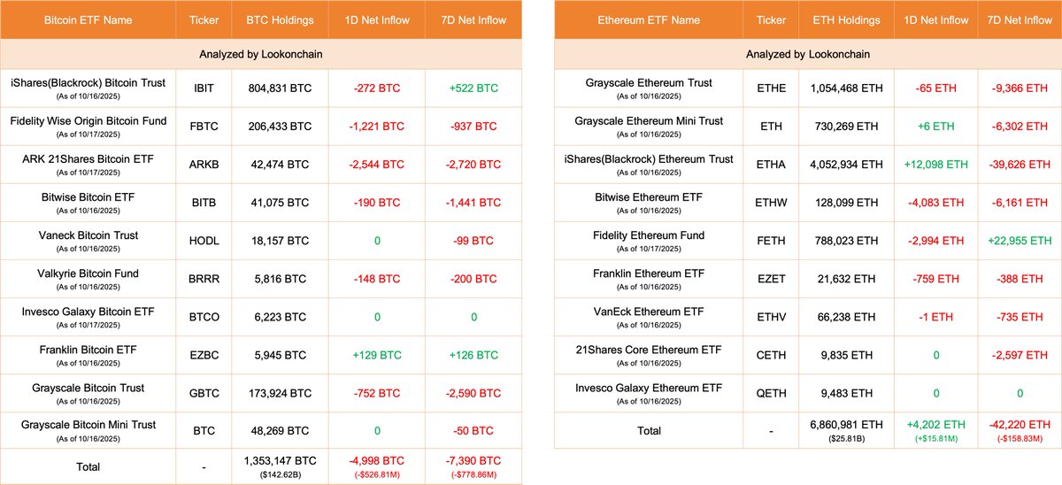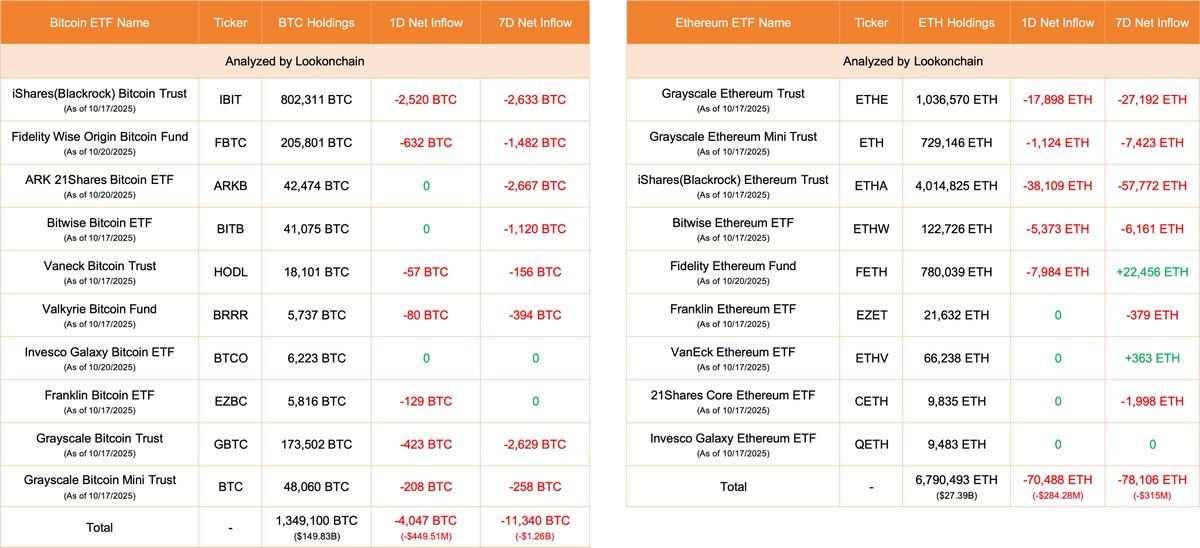 10月20日更新:10 #Bitcoin ETF净流出:-4,047 $BTC(-$449.51M)🔴 #BlackRock 流出2,520 $BTC($279.85M),目前持有802,311 $BTC($89.11B)。9 #Ethereum ETF净流出:-70,488 $ETH(-$284.28M)🔴 #BlackRock 流出38,109 $ETH($153.69M),目前持有4,014,825 $ETH($16.19B)。