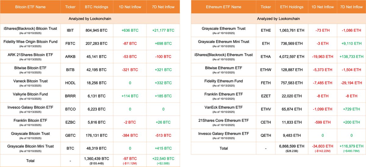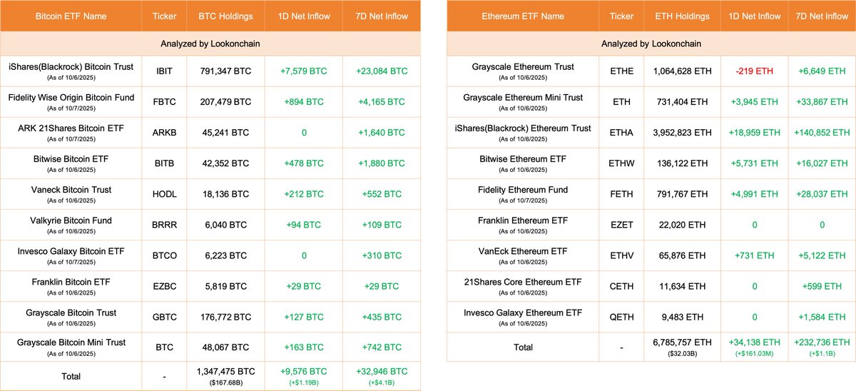 Oct 9 更新: 10 #Bitcoin ETFs 净流入: +3,356 $BTC(+$407.04M)🟢 #BlackRock 流入 3,451 $BTC(+$418.48M) 目前持有 802,198 $BTC($97.29B)。 9 #Ethereum ETFs 净流入: +20,142 $ETH(+$86.61M)🟢 #BlackRock 流入 32,968 $ETH($141.76M) 目前持有 4,083,486 $ETH($17.56B)。