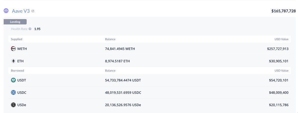 他目前在Aave上存有83,816 $ETH($288.6M),并借了$122.89M的稳定币。