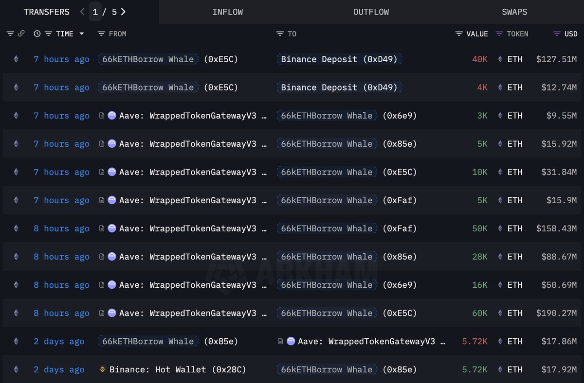 鲸鱼#66kETHBorrow最近购买了444,895 $ETH($1.39B),现在开始卖了吗?8小时前,他从#Aave提取了177K $ETH($561.3M)并存入44K $ETH($140.2M)到#Binance。他的购买成本约为$3,437,目前亏损约$125M。