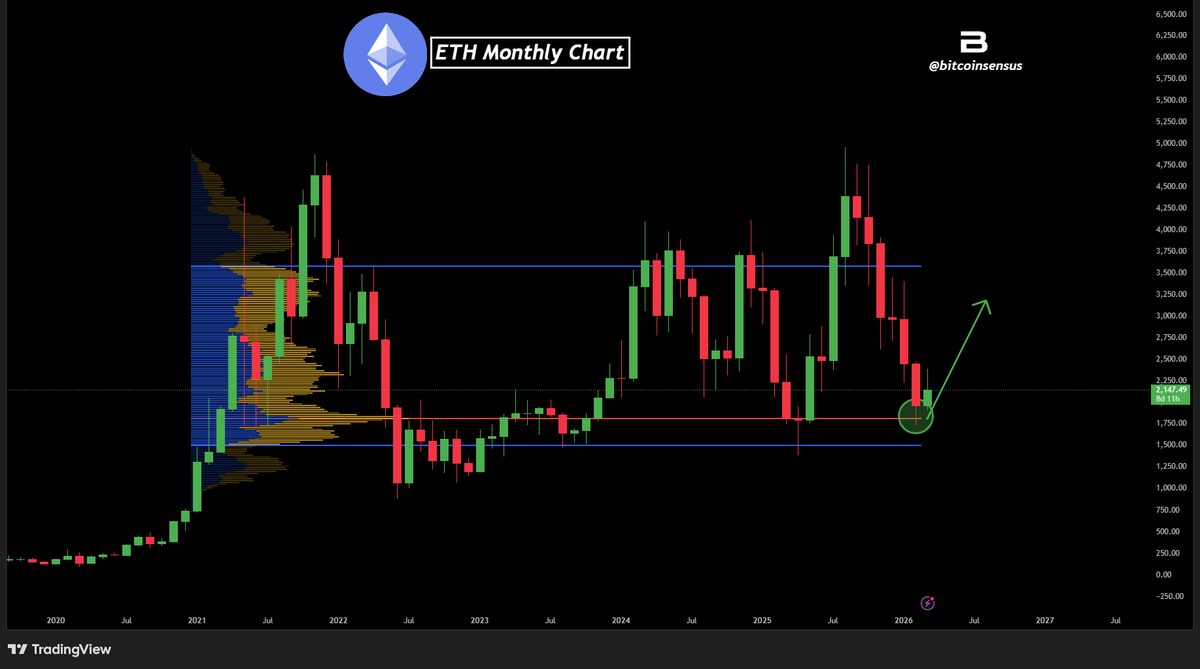 以太坊的月度图表再次与同一上升趋势线互动,该趋势线自2022年中期以来支撑了每一个主要更高的低点。