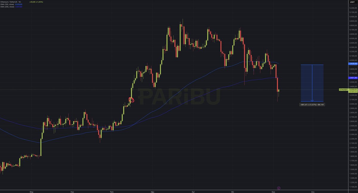 #ETH 在上一个周期中,与2018年1月的前高点相比,这次距离周期顶部还有4周时间,并且交易价格高出约200%