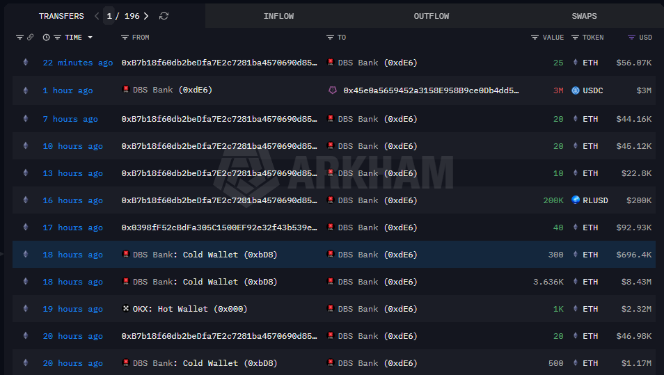 7小时前,#DBS - 新加坡最大的银行,从#Galaxy_Digital收到了另外2k $ETH(约$6.27M)。