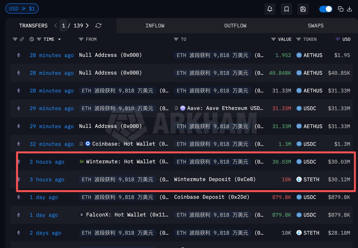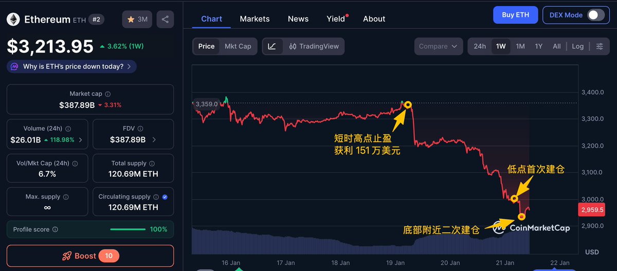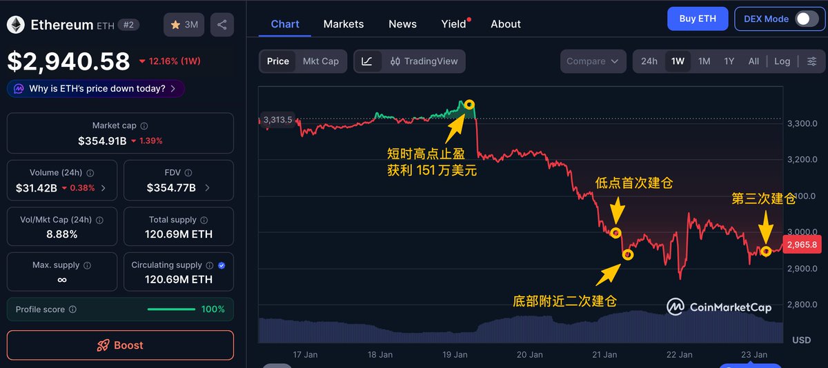 $2896 再次抄底,又买在短时低点了!怎么有人开上帝视角炒币的啊😲 ETH 波段获利 9818 万美元的聪明钱 6 小时前在 ETH 下跌的底部附近再次从 Wintermute 处收到 10000 枚 ETH(约 2896 万美元),疑似 OTC 买入 昨天起他已加仓 30000 枚 ETH(约 8837 万美元),平均成本约 $2945.7,浮盈 97.3 万美元