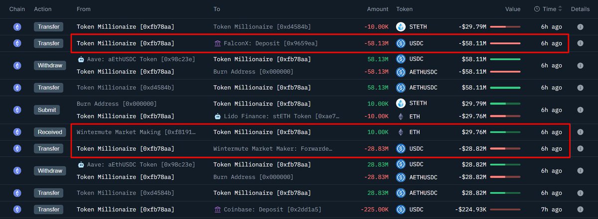 好在「ETH 波段获利 9922 万美元的聪明钱」还在买😃 3 小时前他向 #FalconX 充值 5605 万枚 USDC,随后从中提出 20000 枚 ETH,大概率为购买行为,成本 $2819.92;2 天前他以 $3011.68 卖出的 1 万枚 ETH,现在又低价买回来了 自 01.21 起囤积的 80013 枚 $ETH 目前成本 $2,885.75,浮亏 643 万美元