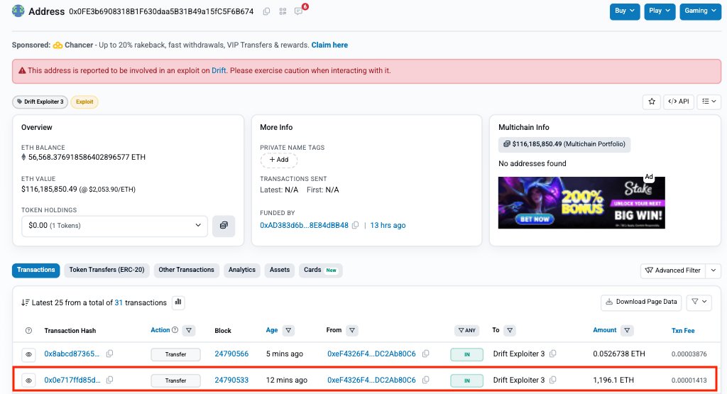 #PeckShieldAlert Drift Protocol @DriftProtocol 遭到攻击,损失超过$285M - 超过其TVL的50%。$DRIFT暴跌-37%。攻击者已通过CCTP TokenMessengerMinterV2将被盗资产从#Solana桥接至#Ethereum,转移了129K $ETH(价值约$270.9M)。