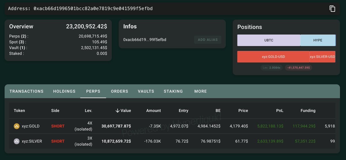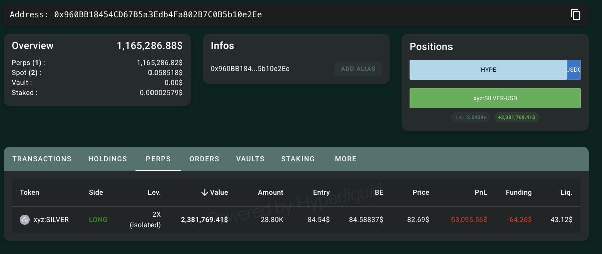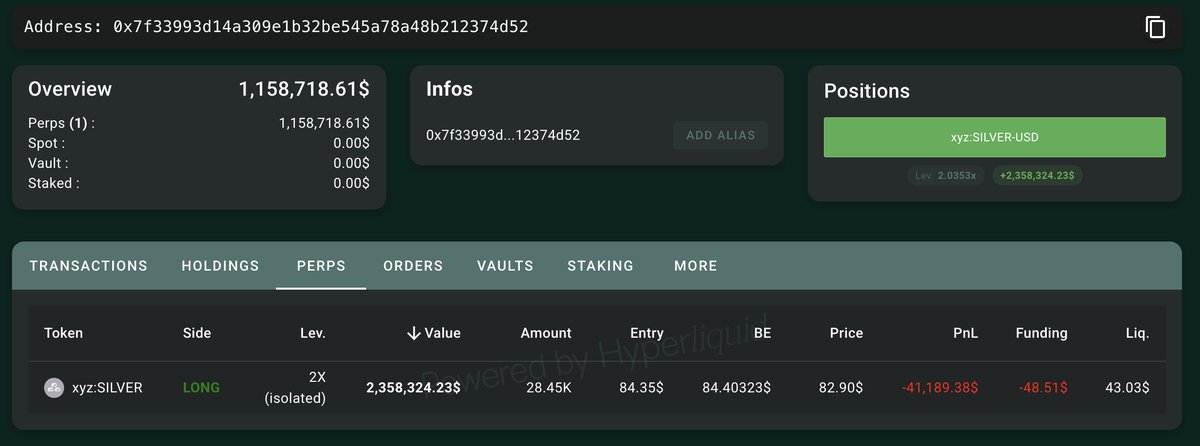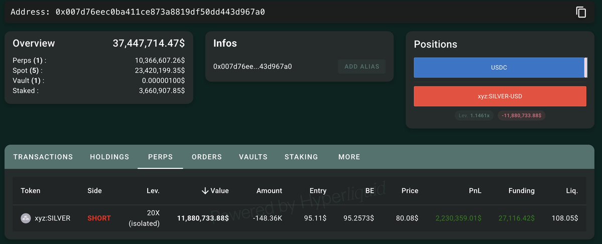 最大的链上#silver空头,0x007d,持有148,359 xyz:SILVER(1188万美元),目前盈利223万美元。