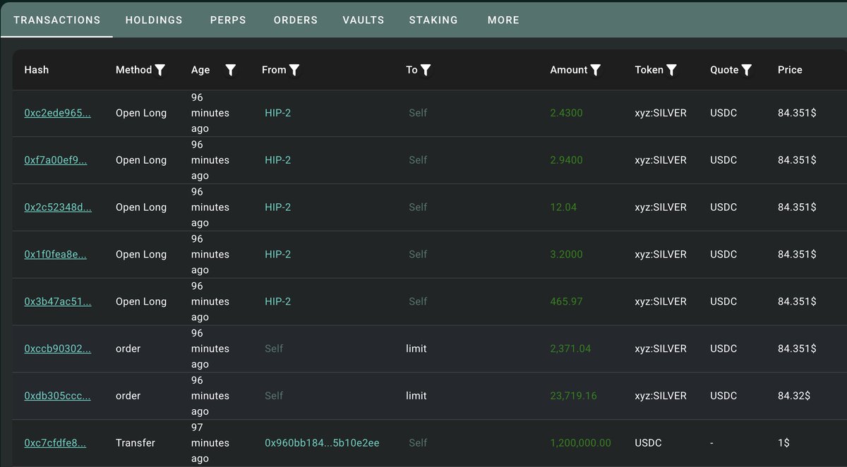 一条巨鲸在过去两小时内使用两个钱包(0x7f33和0x960B)对#silver开了2倍多头。总持仓:57,250 xyz:SILVER($4.73M)。