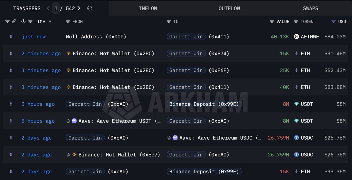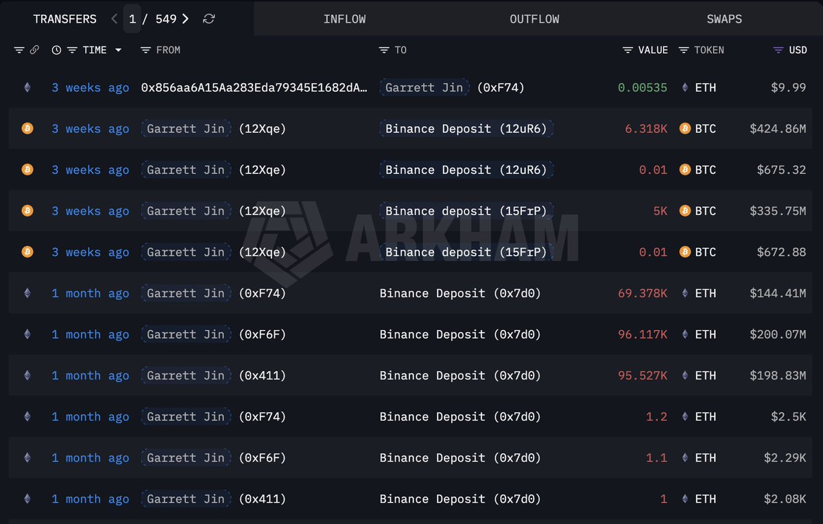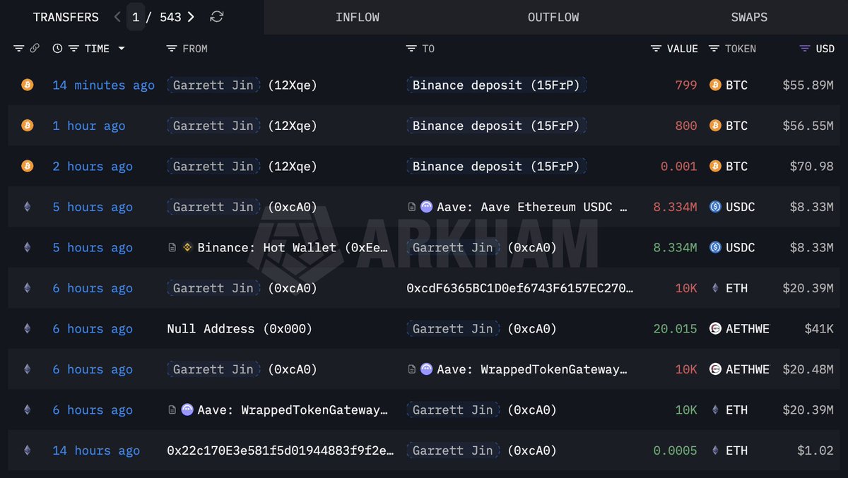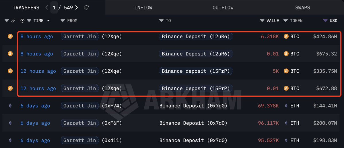 Garrett Jin(#BitcoinOG1011short)上周向#Binance存入了5,000 $BTC($348.82M)和261,024 $ETH($543M)。