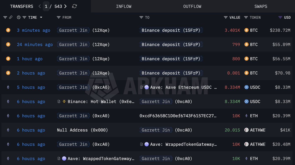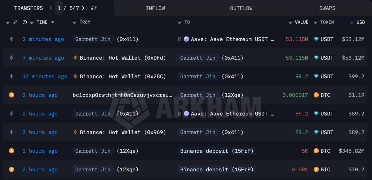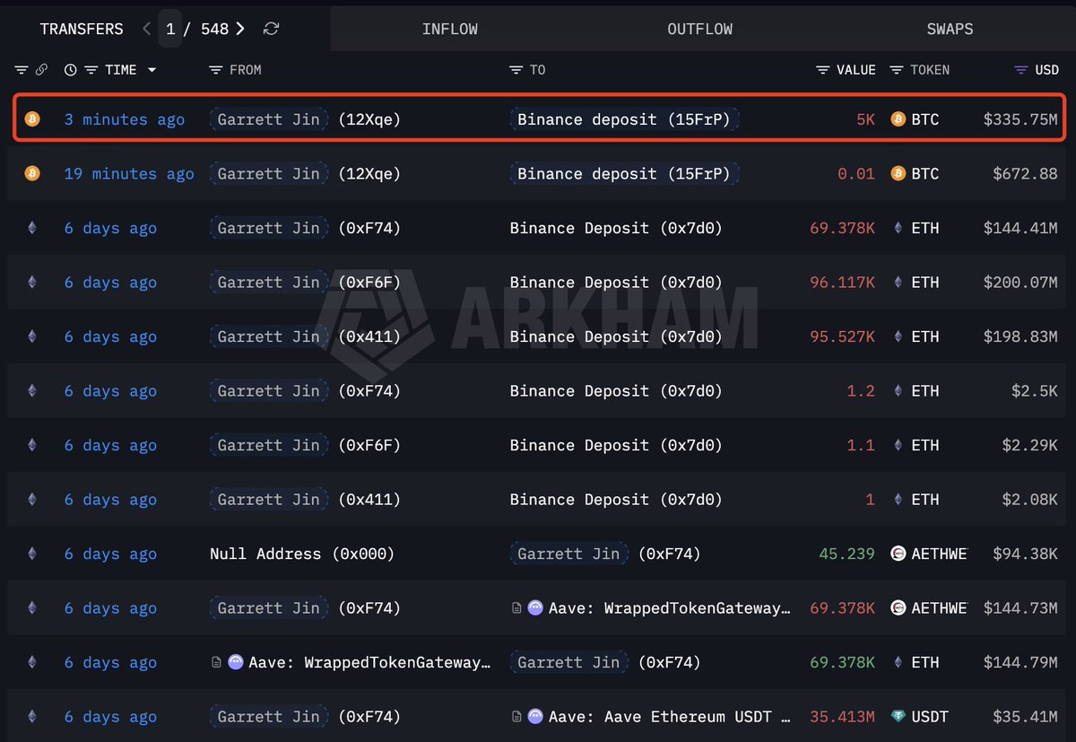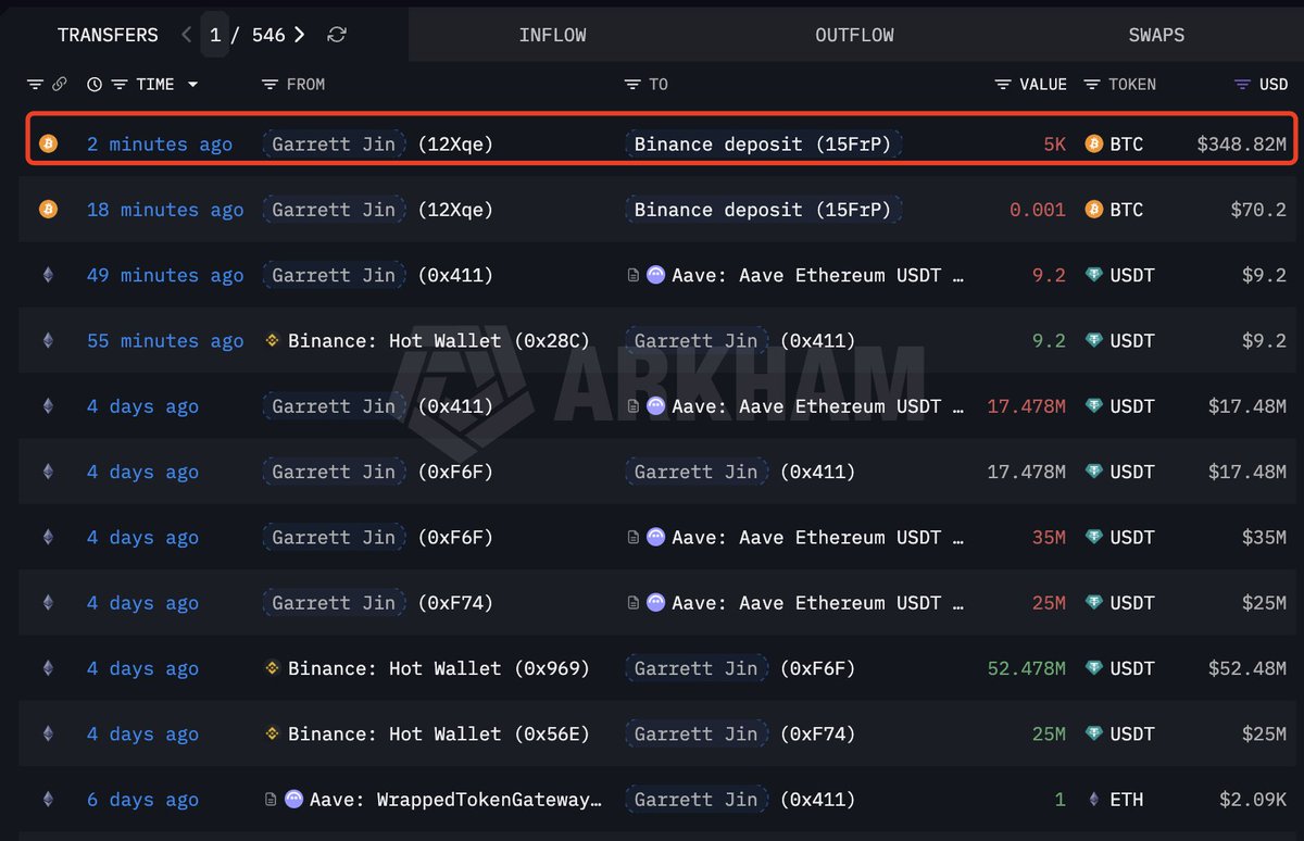 看起来Garrett Jin(#BitcoinOG1011short)确实卖掉了5,000 $BTC($348.82M)。