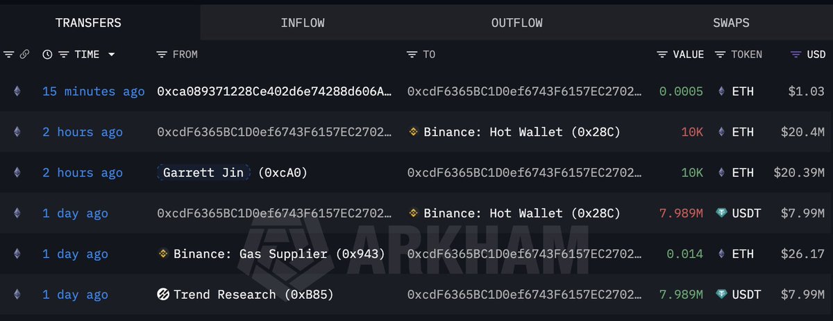 两位损失惨重的#Ethereum多头 — Garrett Jin(#BitcoinOG1011short) 和 Trend Research — 使用了同一个Binance存款地址。