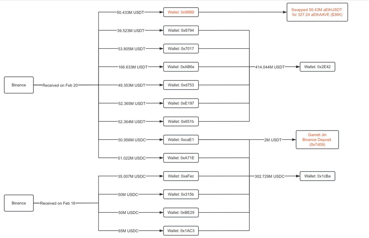 - 所有钱包在2月16日和2月20日从Binance收到了USDC或USDT。