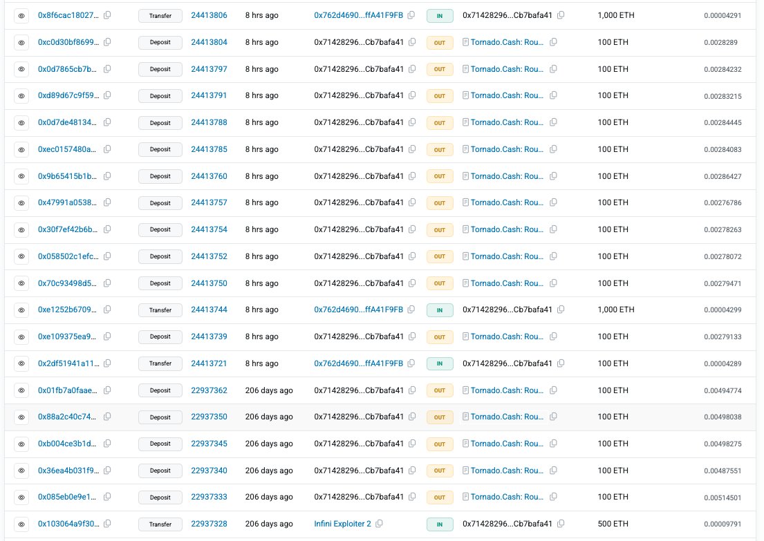Infini 的利用者在 206 天后恢复洗钱活动,在 0x7142829618aDeB8C70cAf7A2e7Ca413Cb7bafa41 于 2025 年 7 月存入 5,000 ETH 后,又向 存入 15,470.7 ETH(约 3200 万美元)。