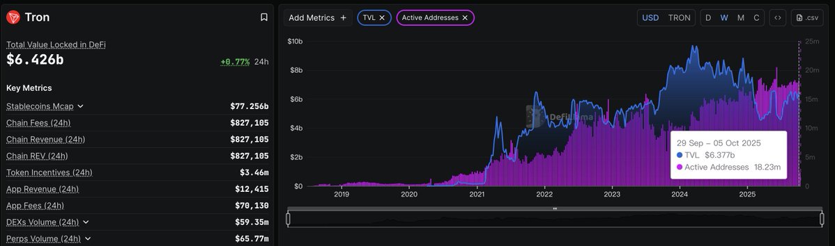 上周,#Tron 的TVL达到$6.377B(周环比+5.84%),活跃地址攀升至18.23M(周环比+2.24%)。