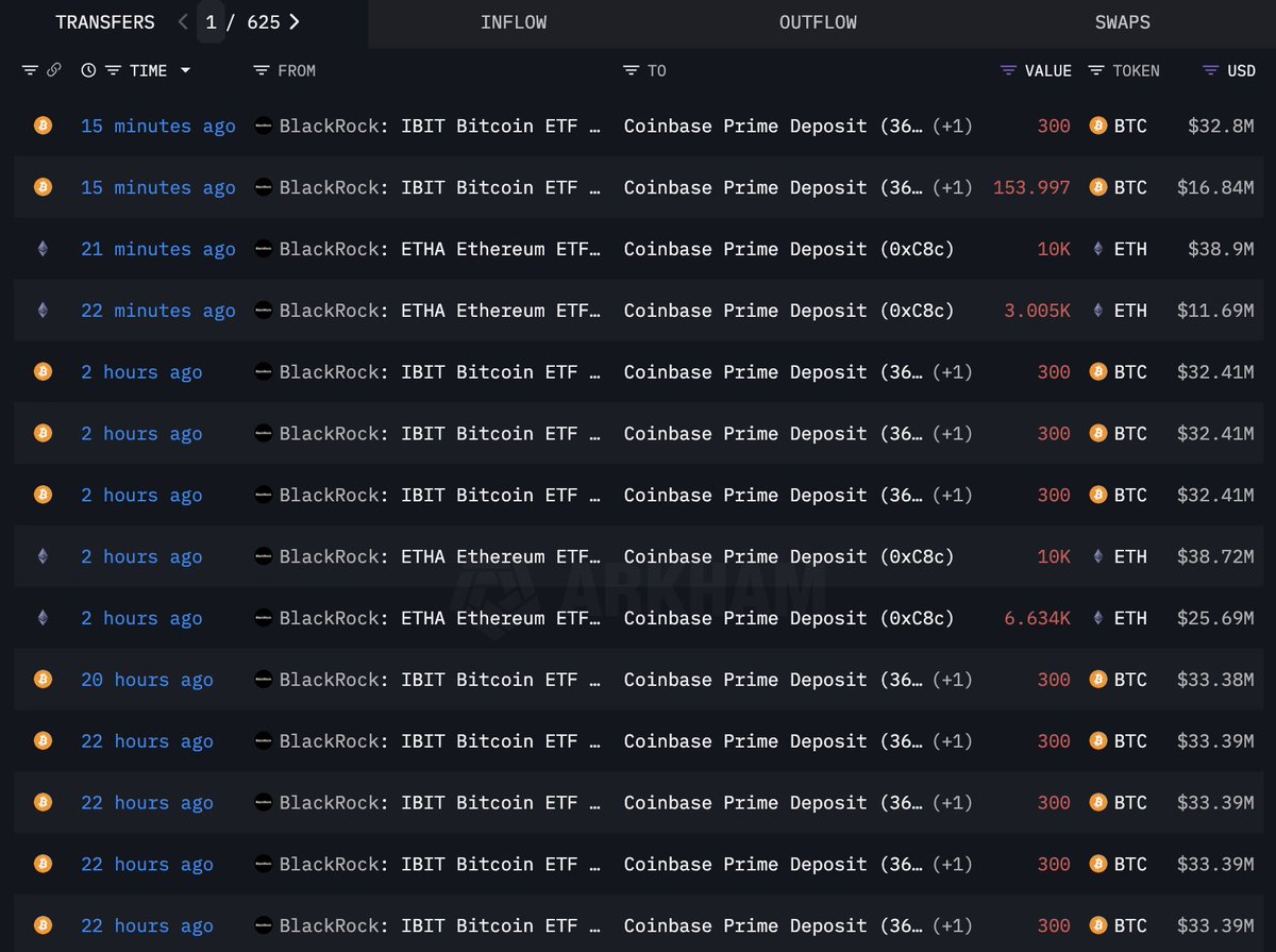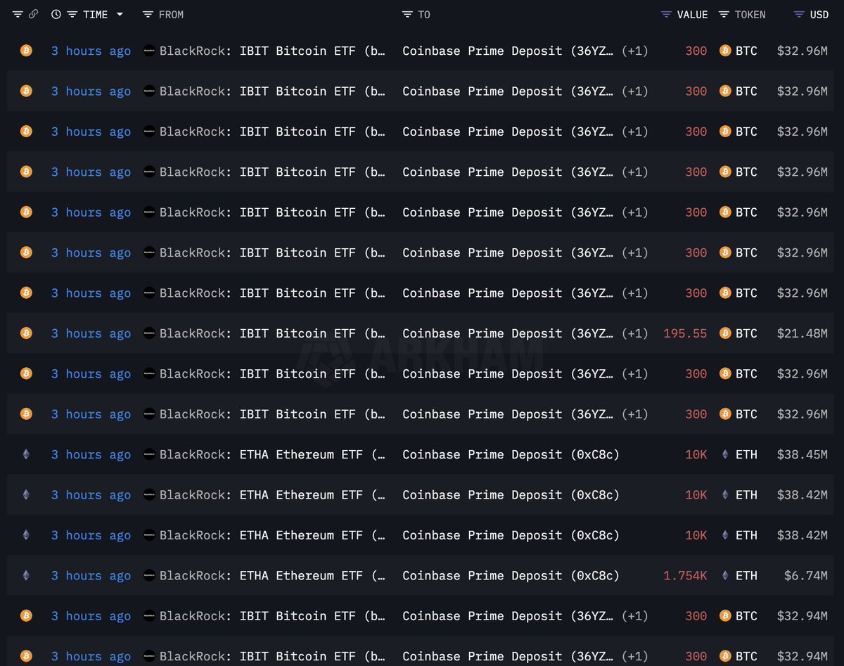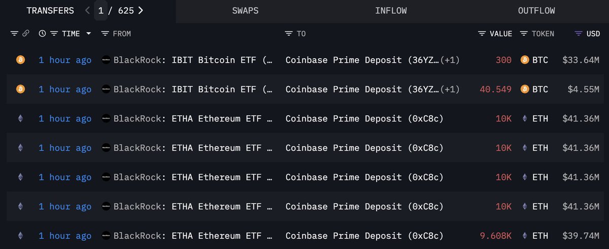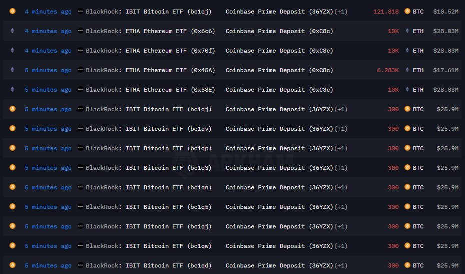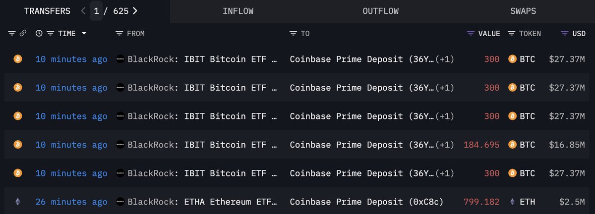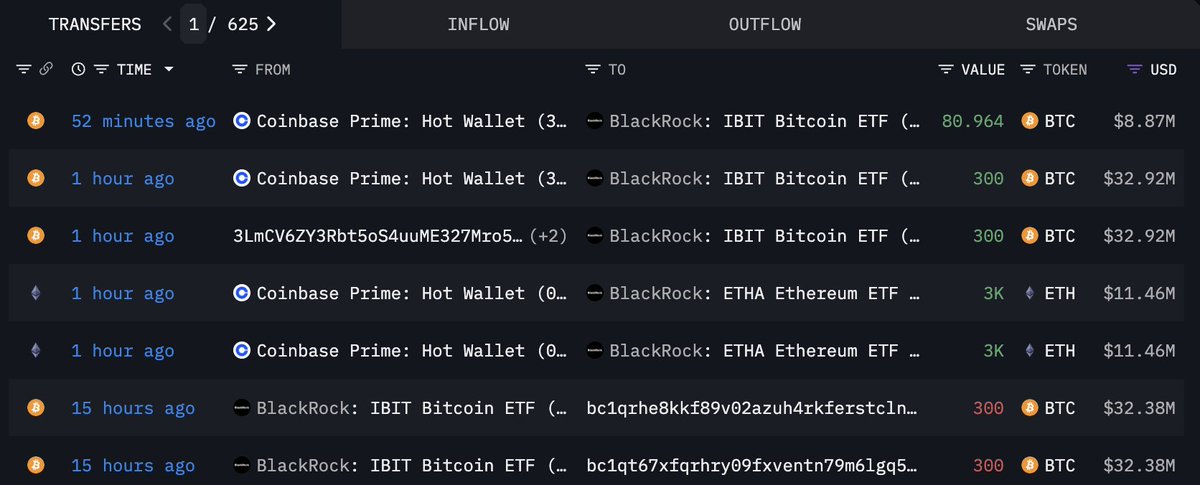 与此同时,BlackRock一小时前从#CoinbasePrime提取了681 $BTC($74.72M)和6,000 $ETH($22.91M)。