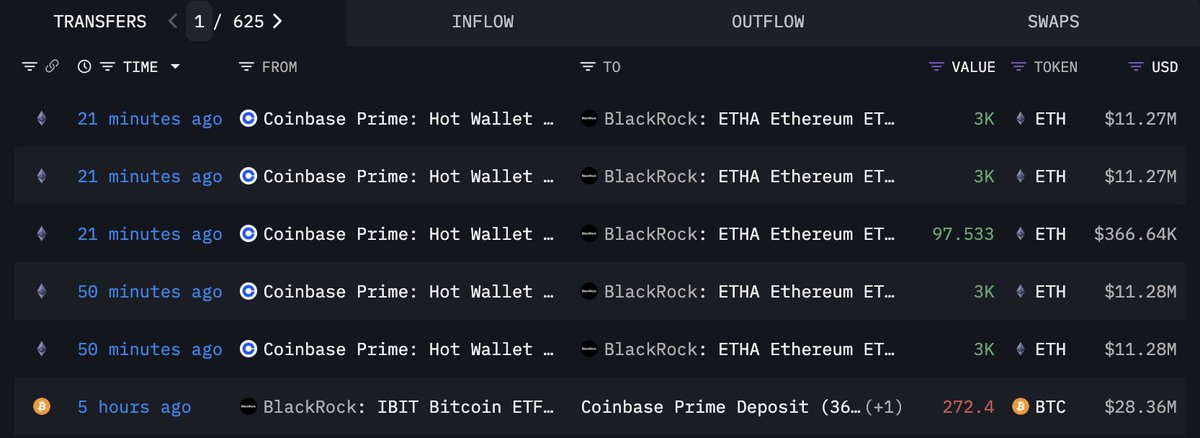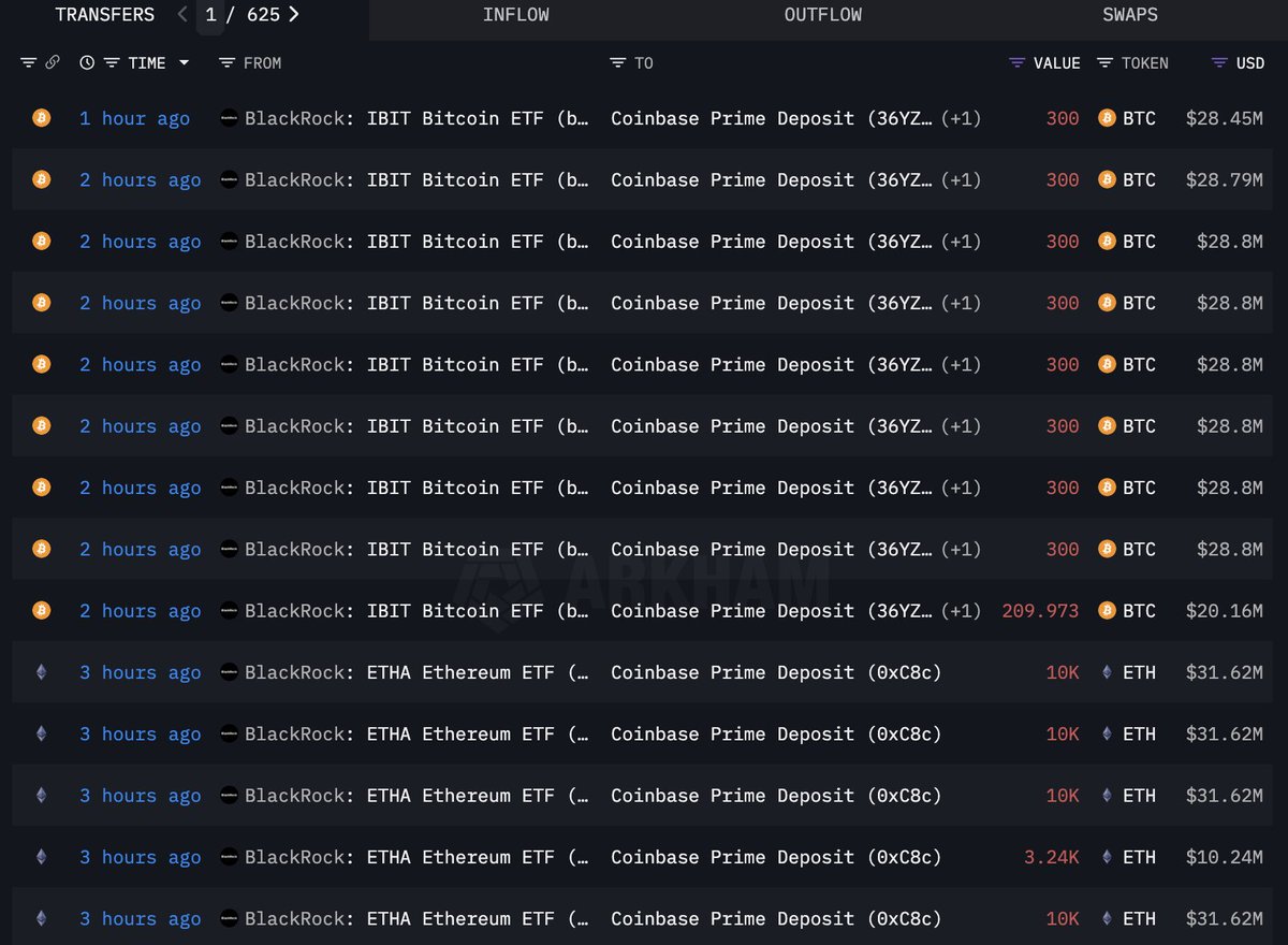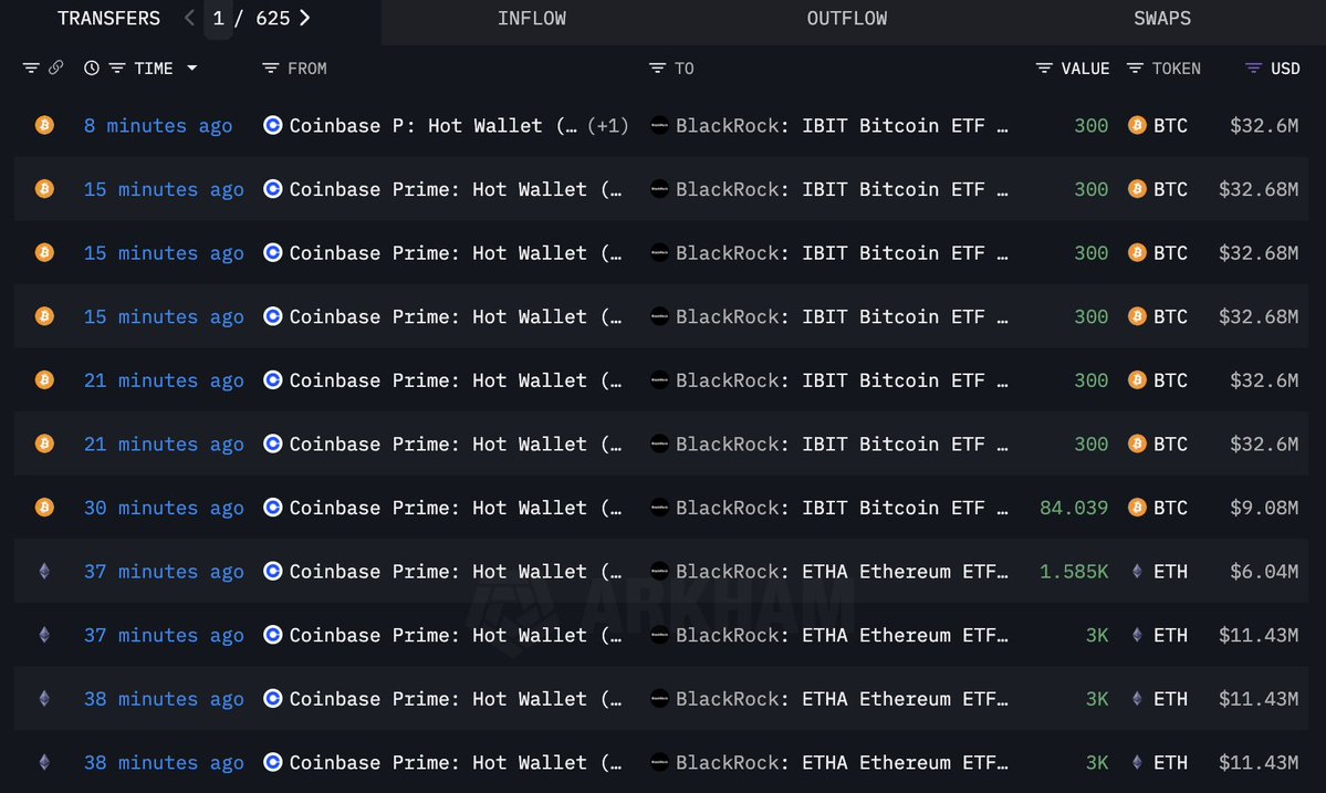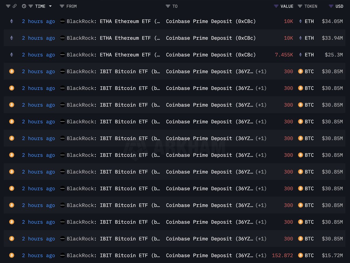 与此同时,BlackRock一小时前从#CoinbasePrime提取了681 $BTC($74.72M)和6,000 $ETH($22.91M)。