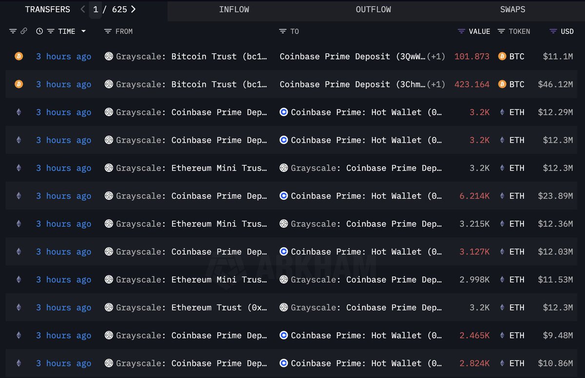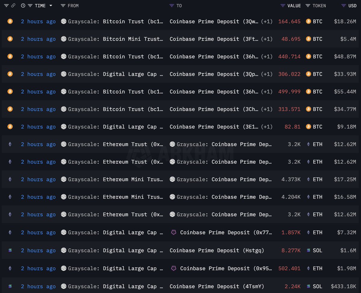 Grayscale三小时前向#CoinbasePrime存入了525 $BTC($57.22M)和21,030 $ETH($80.84M)。