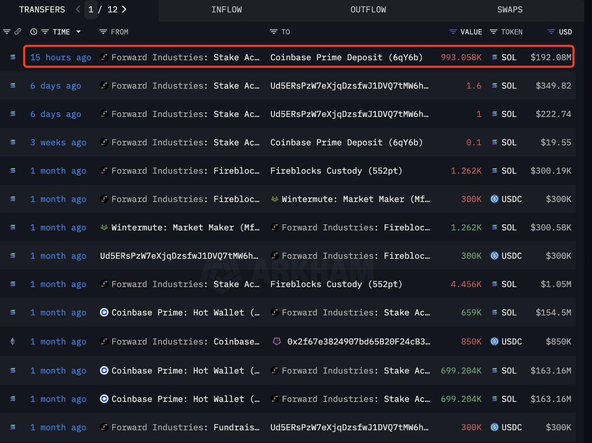 Forward Industries — 之前以232美元的价格购买了682万枚SOL(价值13.8亿美元)— 刚刚在15小时前向#CoinbasePrime存入了993,058枚SOL(价值1.9208亿美元)。