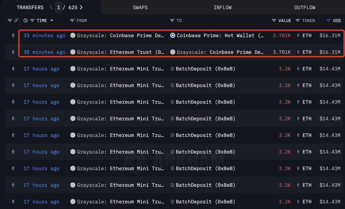 Grayscale刚刚向#CoinbasePrime存入了3,701 $ETH($16.3M)。