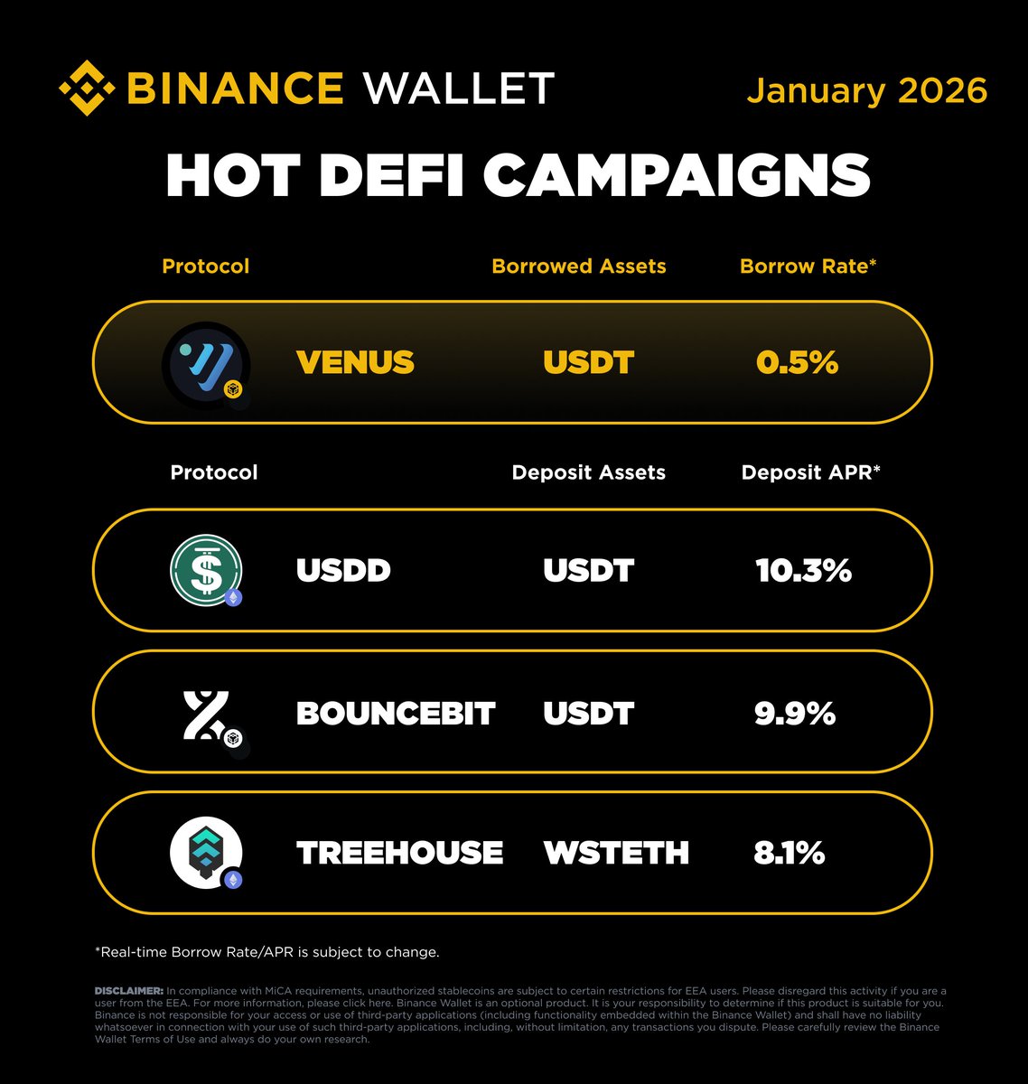 🔥在Web3贷款Venus USDT池中借入USDT,并通过#BinanceWallet在BNB DeFi Festival享受1.2%的借款利率*!