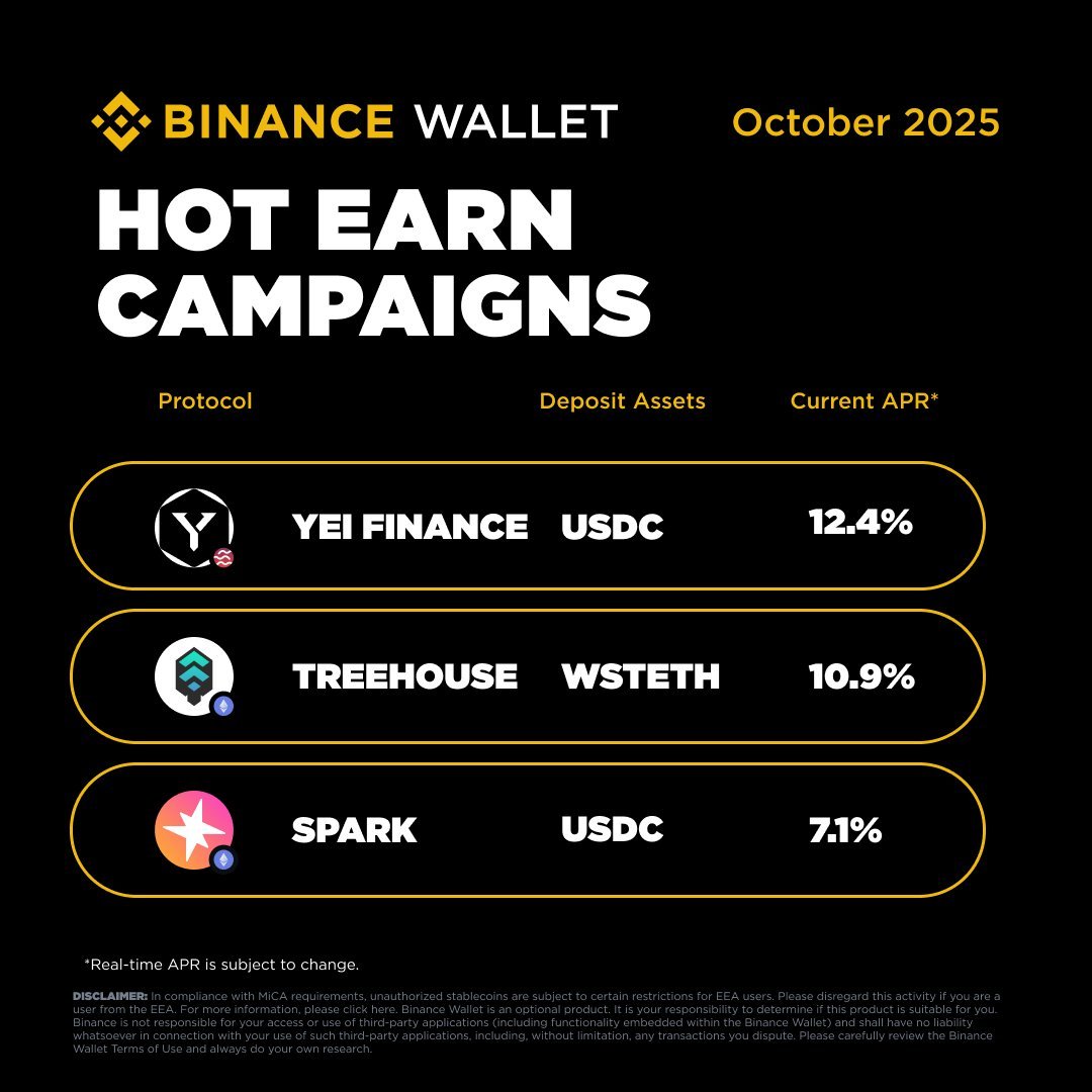 本月在Binance Wallet Earn查看顶级独家活动!在#BinanceWallet上锁定有吸引力的实时年利率,与顶级协议合作:@YeiFinance @TreehouseFi @sparkfi