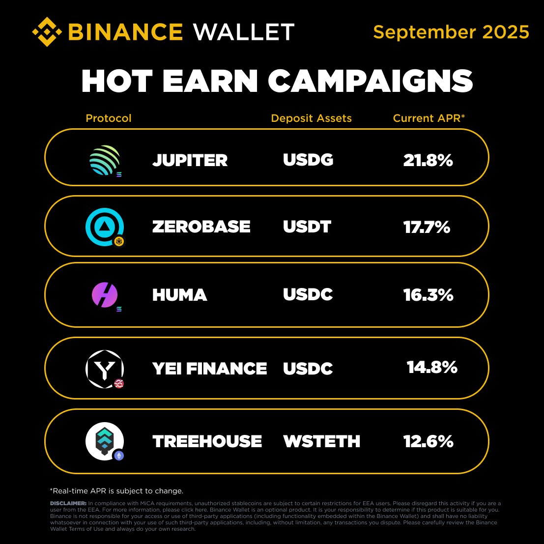🚀 提升您的加密货币收益!别错过。本月在Binance Wallet Earn查看顶级独家活动!在#BinanceWallet上锁定诱人的实时年化收益率,与顶级协议合作: @JupiterExchange @zerobasezk @humafinance @YeiFinance @TreehouseFi 最大化您的回报。立即开始!