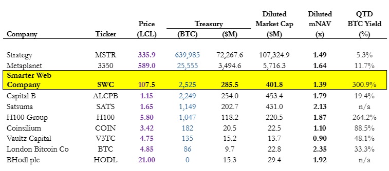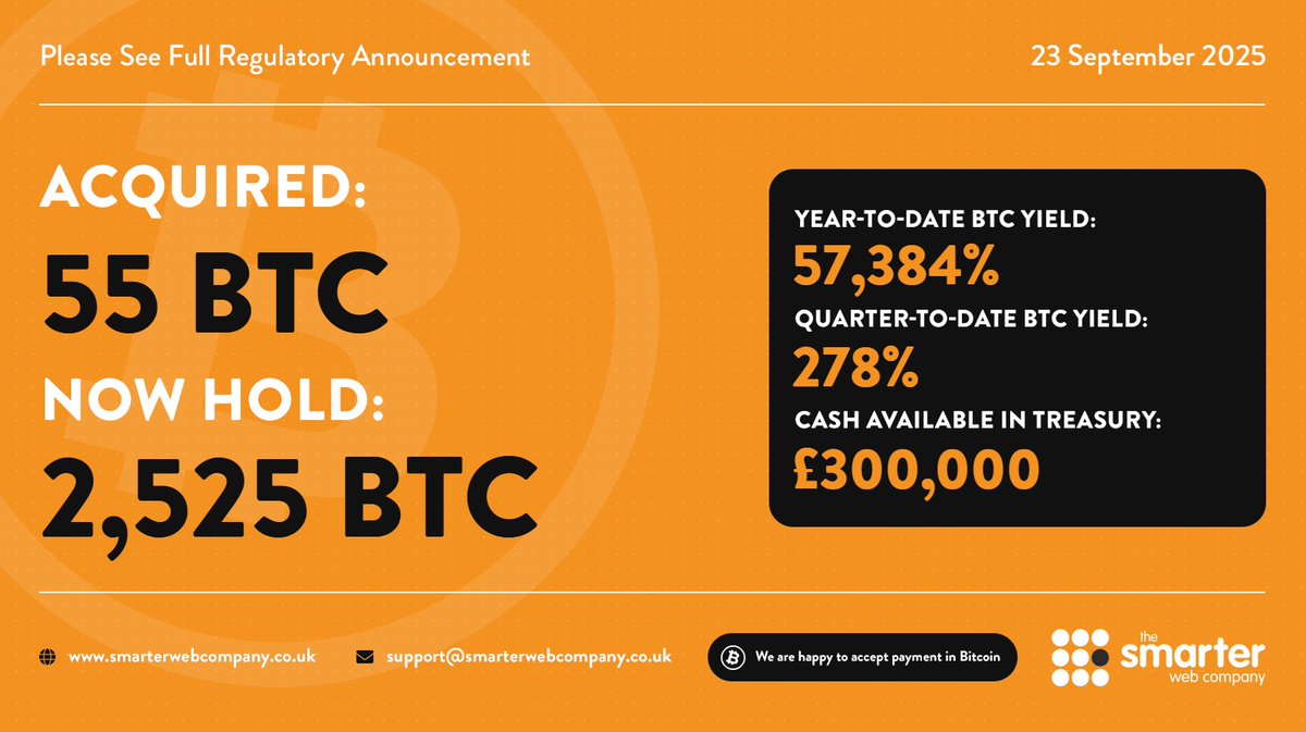 The Smarter Web Company(AQUIS:#SWC | OTCQB:$TSWCF | FRA:$3M8),一家伦敦上市的科技公司,也是英国资产负债表上持有比特币的最大公开交易公司,很高兴宣布于2025年10月3日以收盘价(“发行价”)进行配股。
