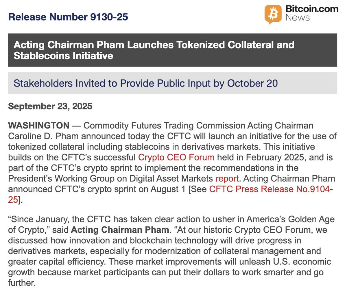 JUST IN: 🇺🇸 美国商品期货交易委员会推进代币化抵押品计划,为在GENIUS法案实施推动下将#Stablecoins作为衍生品市场保证金铺平道路。