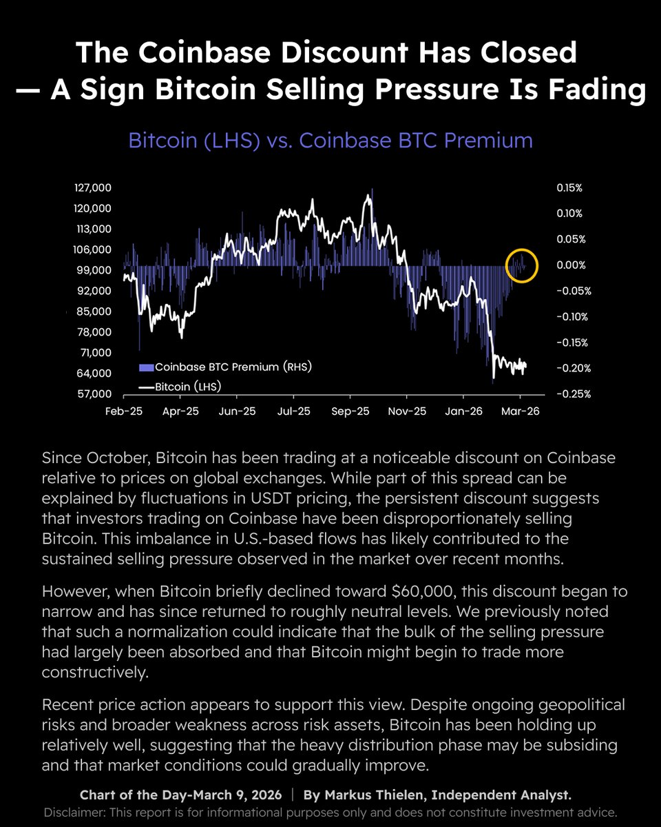 Coinbase折扣已关闭——比特币抛售压力正在减弱的信号