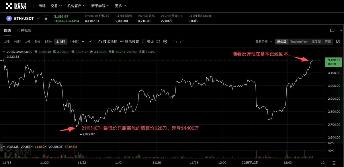要是 ETH 涨到 $3,200,他这次做多就能从浮亏 $4400 万到回本了。