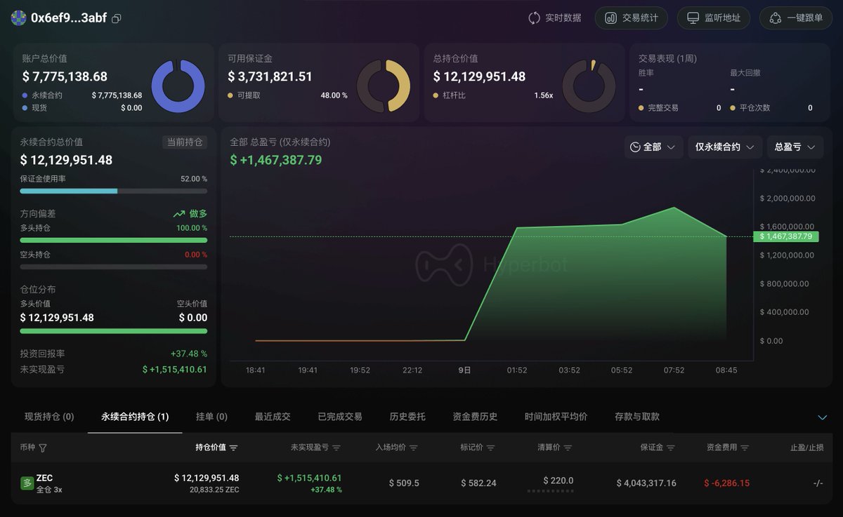 一个鲸鱼在 8 小时前以 $509.5 的价格抄底做多 2.08 万枚 ZEC ($1212 万),目前成功浮盈 $151 万。