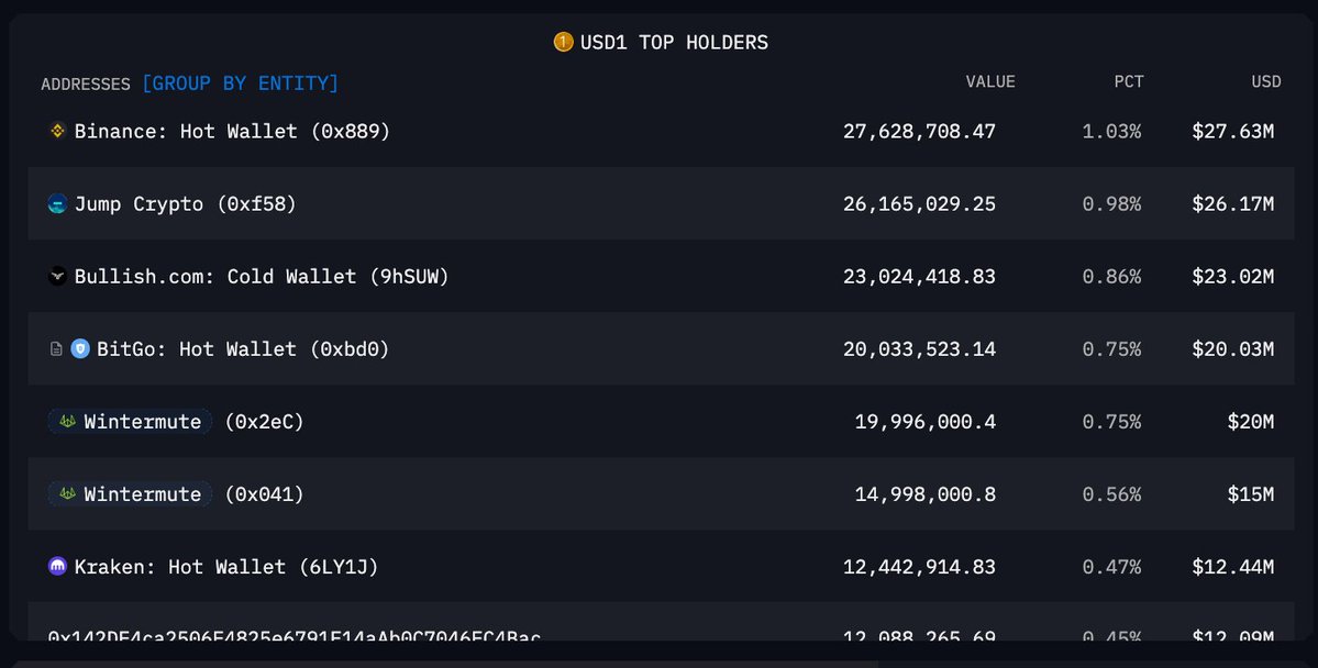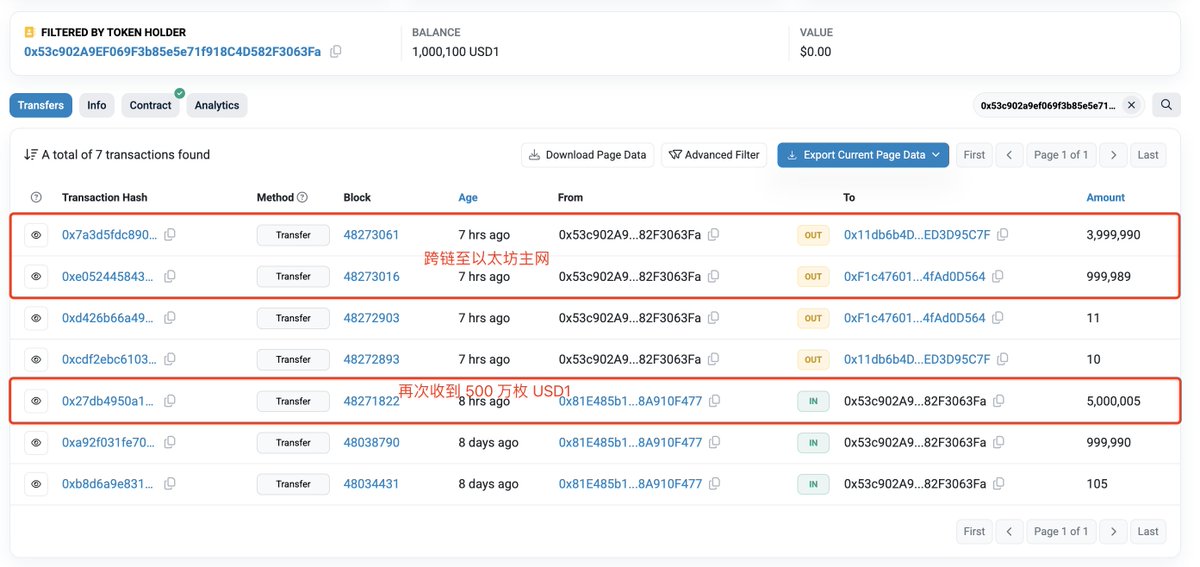 DWF Labs 已成为 WLFI 推出美元稳定币 $USD1 的链上持仓 TOP2 机构,目前持有 600 万枚 USD1😎 既 04.03 收到 100 万枚稳定币后,9 小时前再次在 BSC 网络收到 500 万枚 USD1,随后跨链至以太坊主网