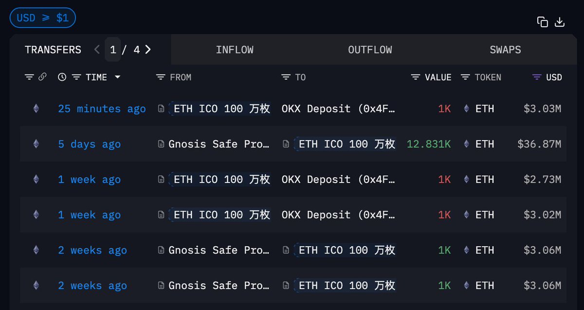 「ETH ICO 100 万枚 $ETH 巨鲸」诠释了什么叫做「成本足够低就能无惧涨跌」,无论 ETH 涨到 $4000 还是跌回 $1400,他都在稳定抛售(成本低至 0.31 美元)😂