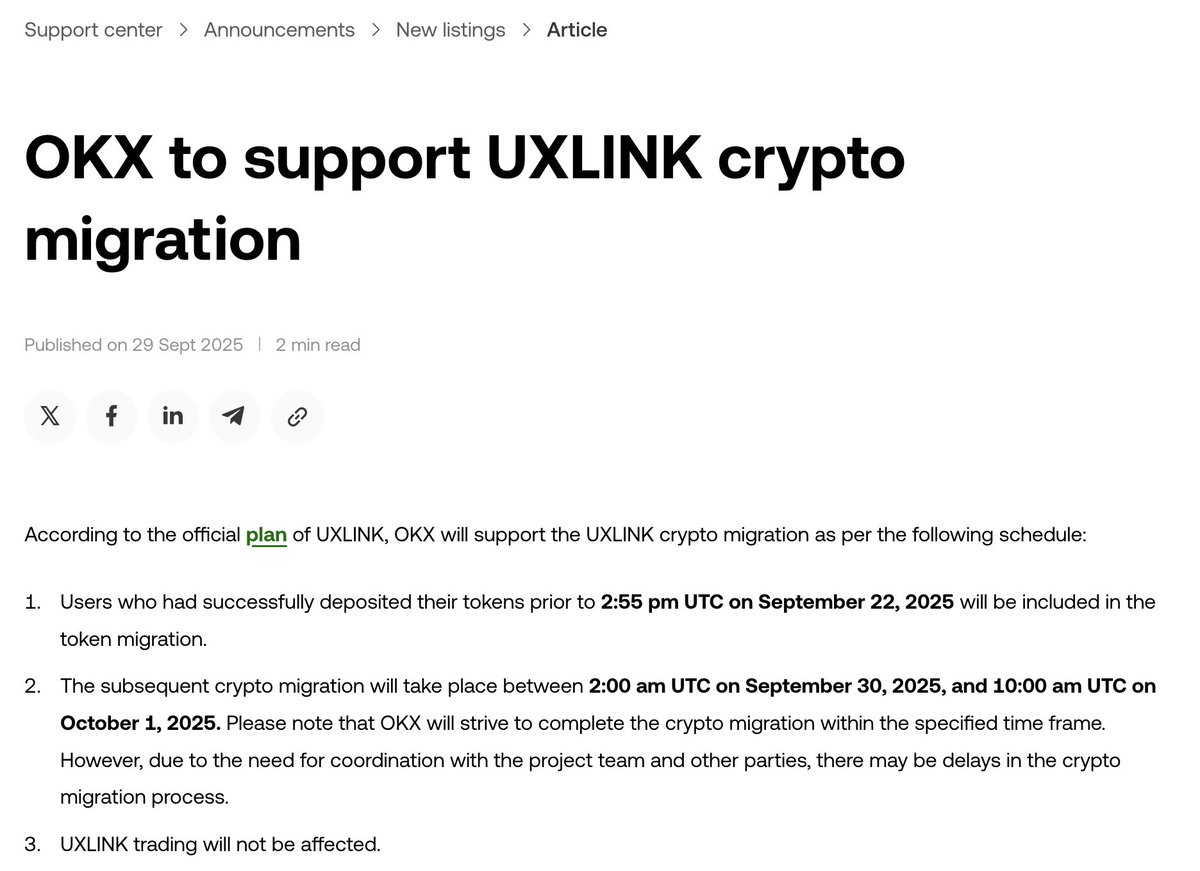 OKX交易所用户持有的所有旧版UXLINK将以1:1的比例进行兑换(存款快照时间:2025年9月22日UTC下午2:55),同时非法代币正在返还中。更多精彩活动即将到来——敬请期待!🚀